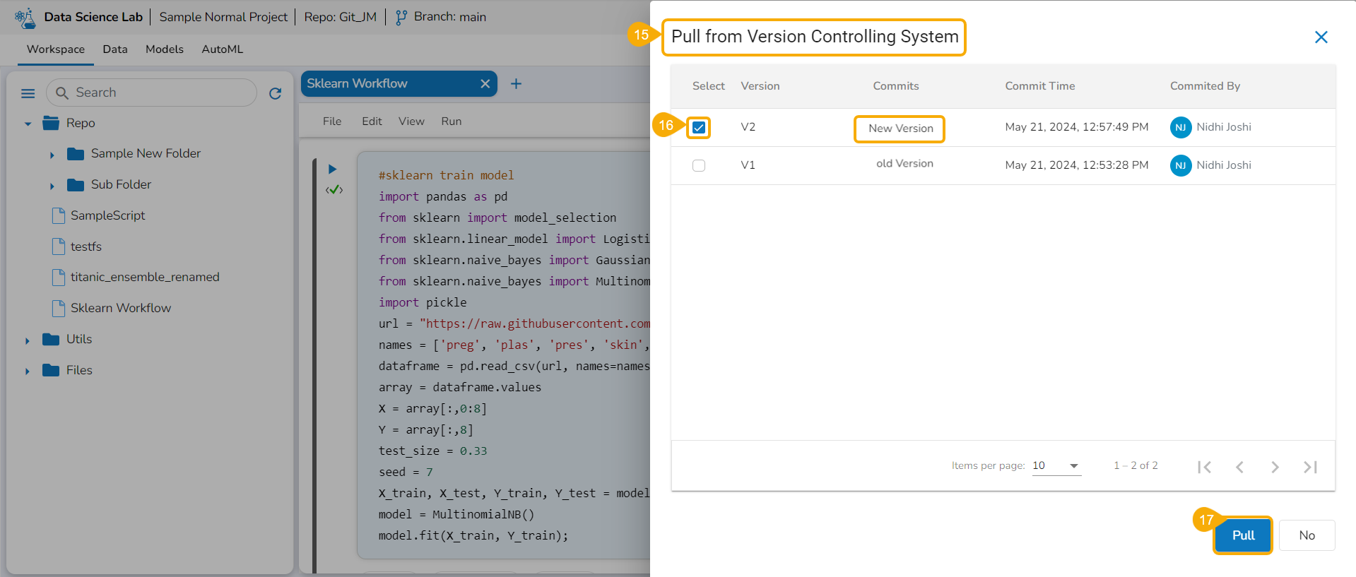 Please Note: The Notebook file from Git gets overwritten with each pull, consistently fetching the latest version and does not allow version selection.