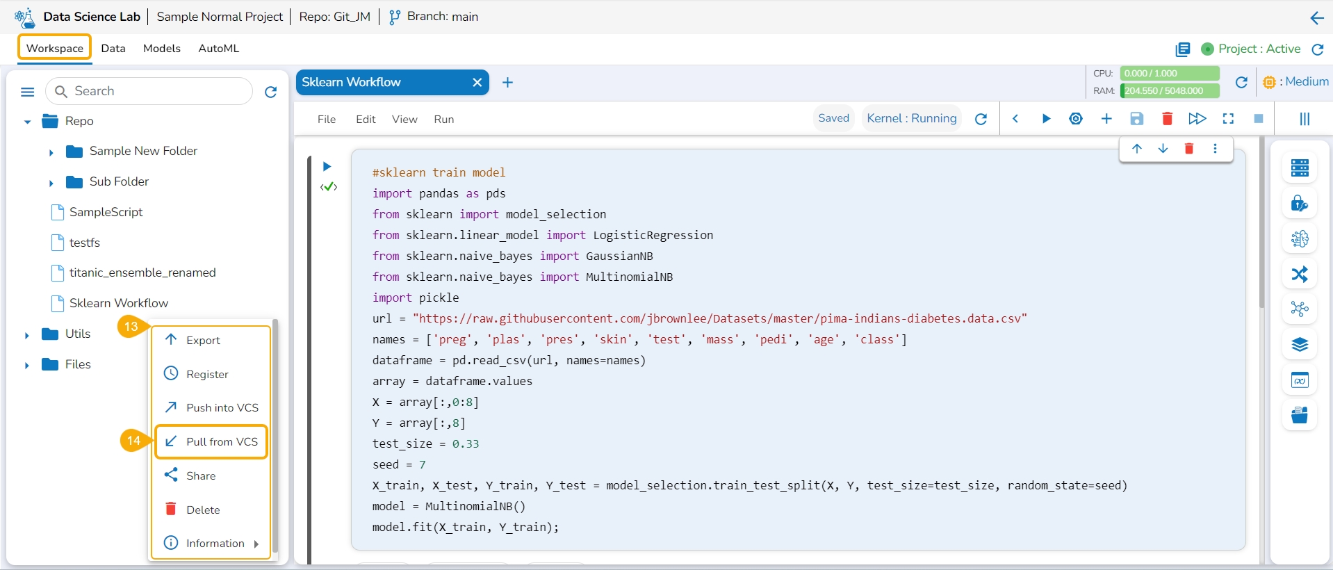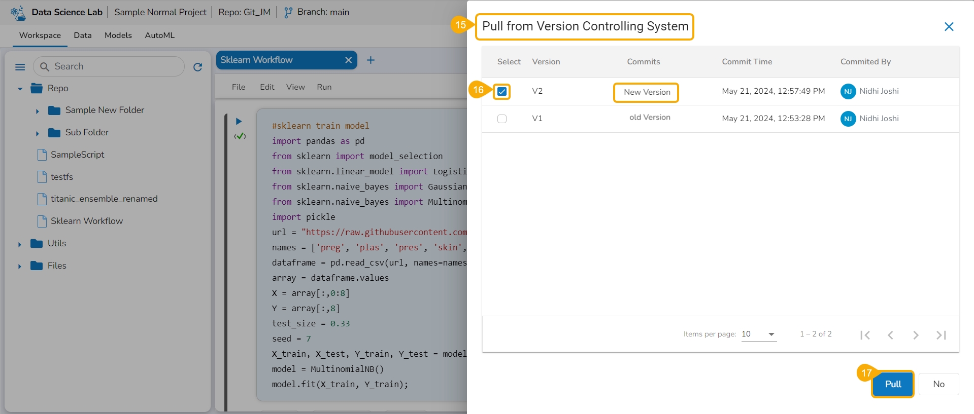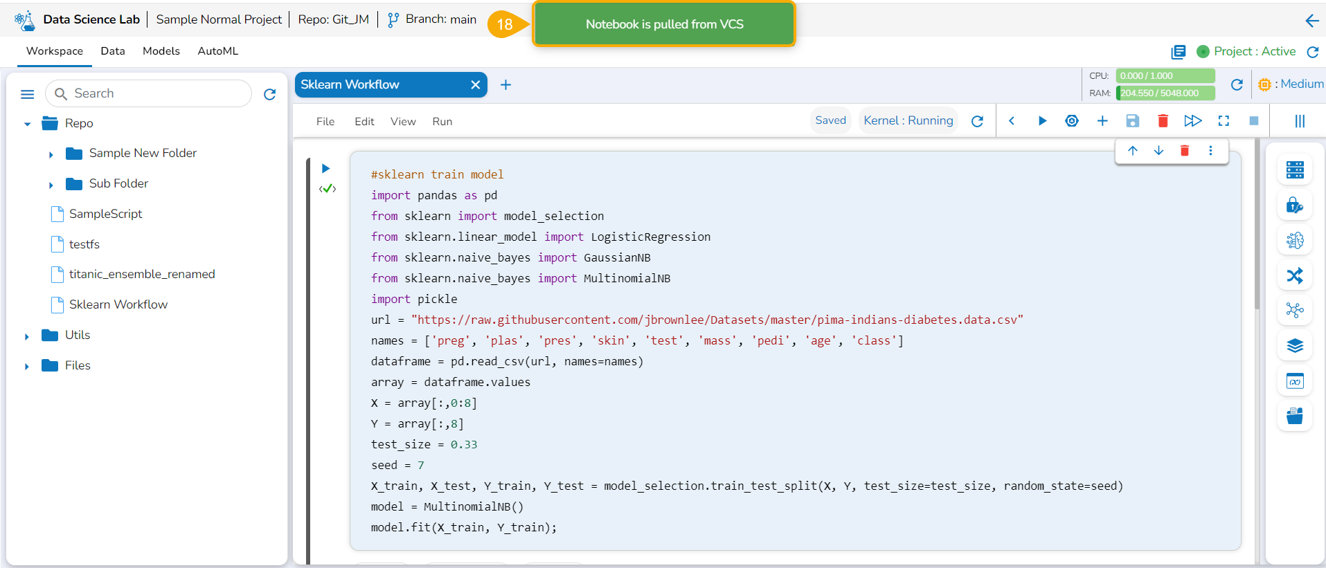 A message appears to notify the user that the Notebook is pulled from the VCS.