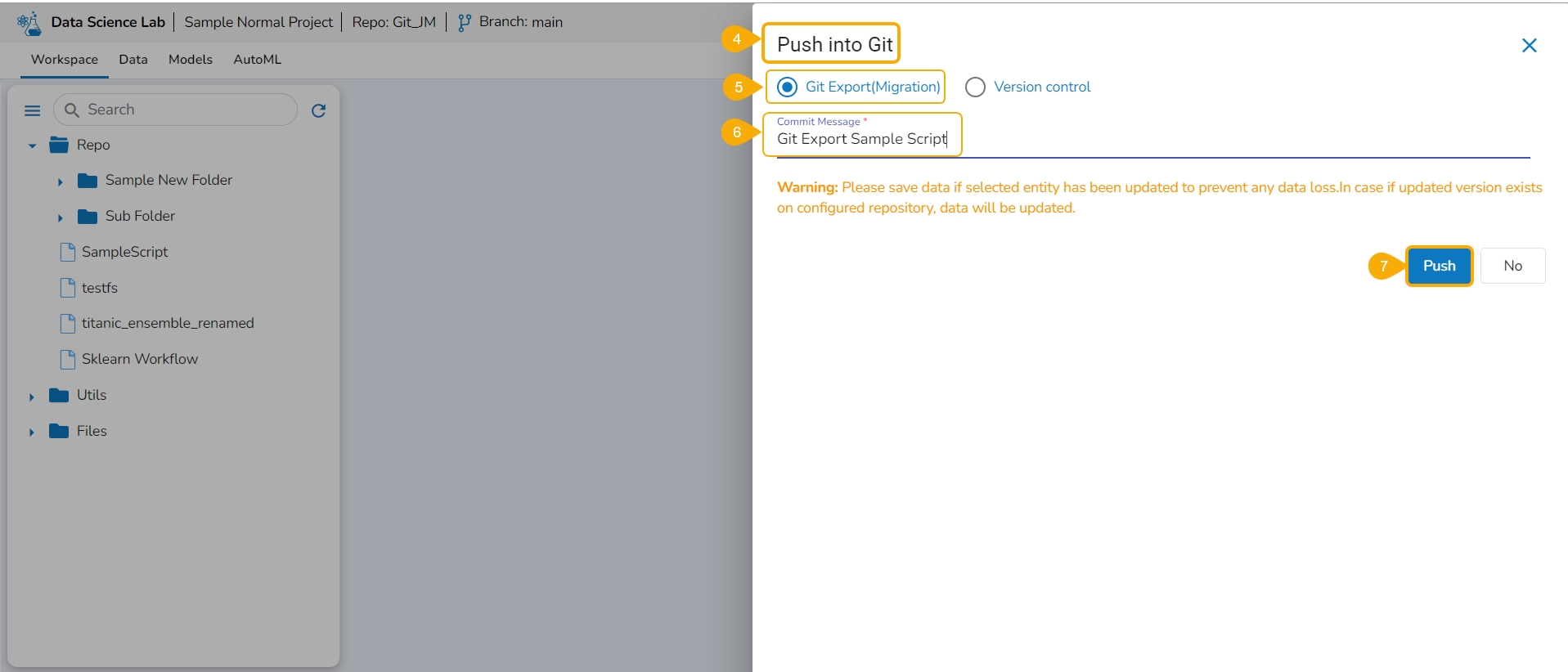 The selected Notebook script version gets migrated to the Git Repository and the user gets notified by a message.
