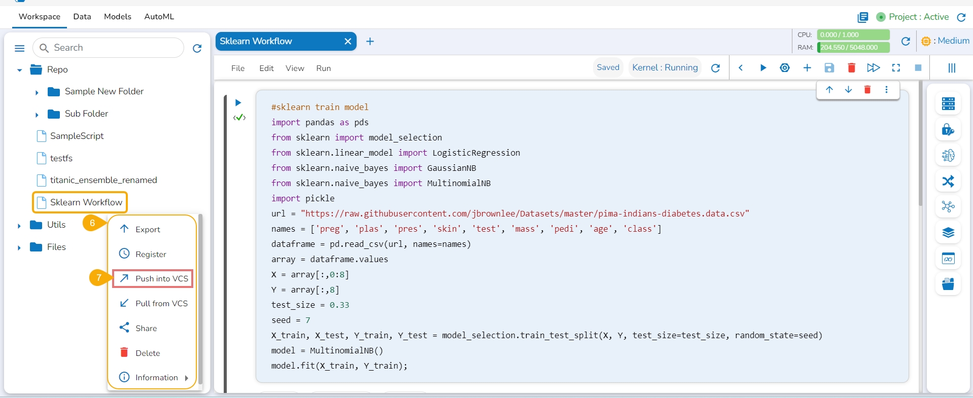 Click the Push into VCS option for the selected Notebook.