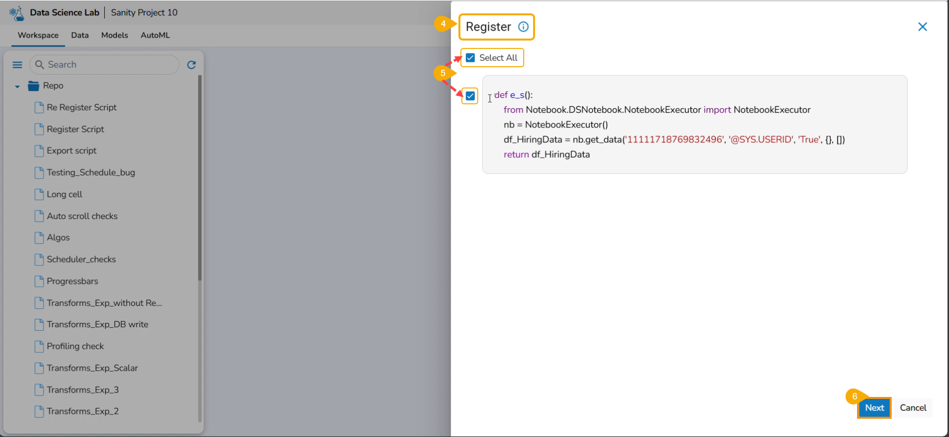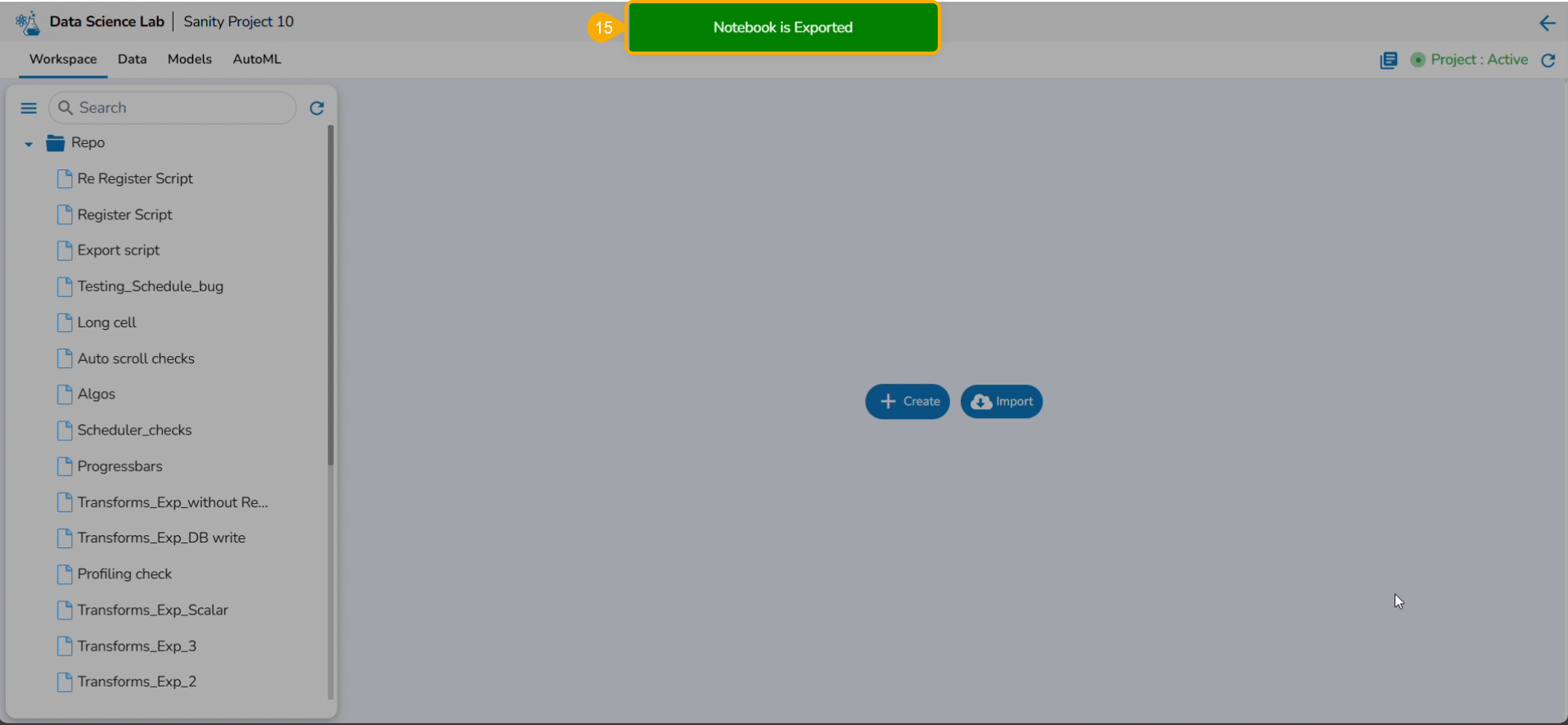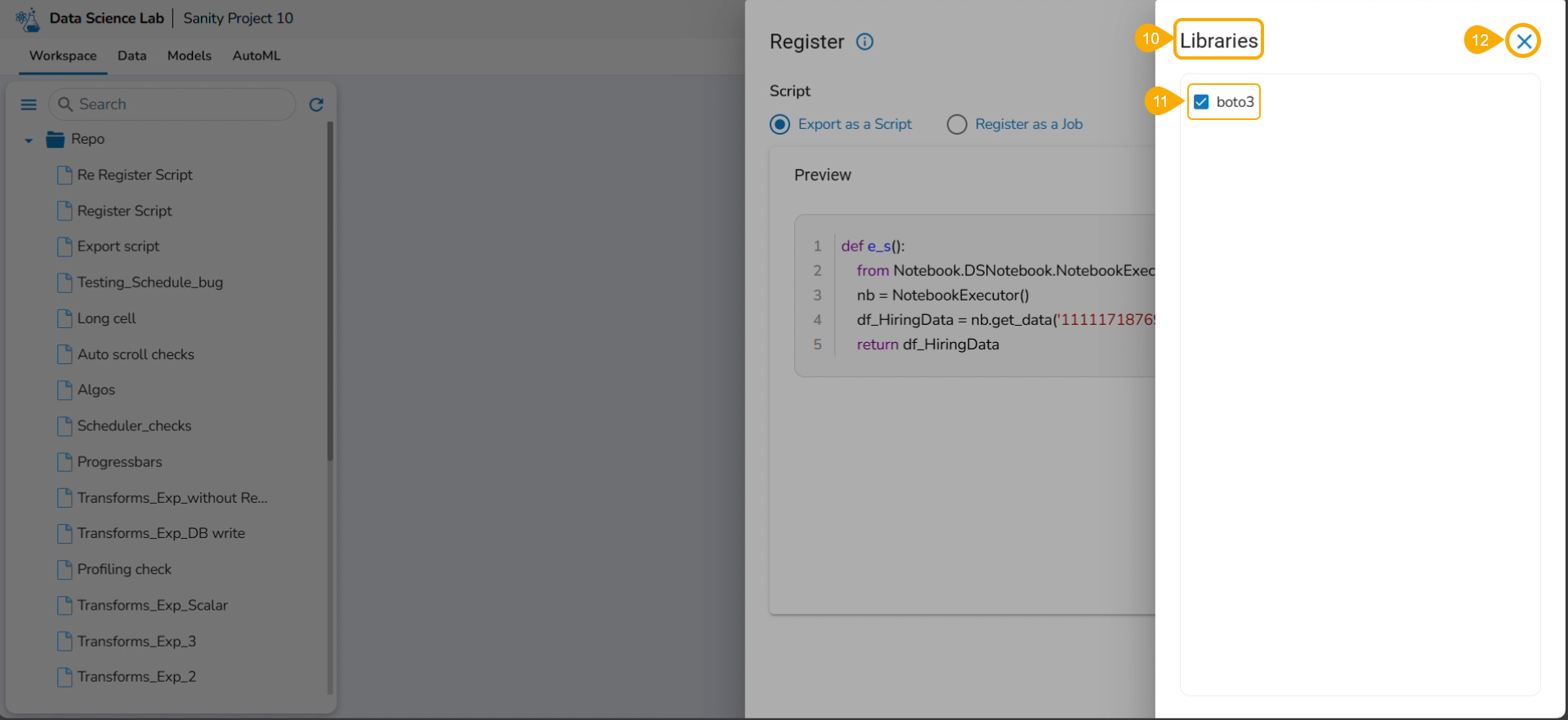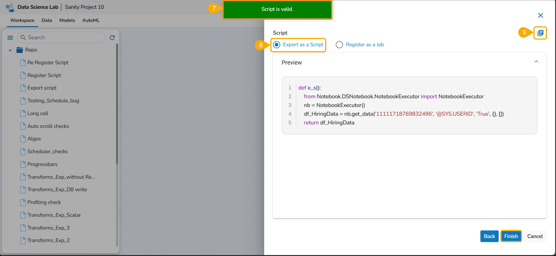 The Export icon provided for a Notebook redirects the user to export the Notebook as a script to the Data Pipeline module and GIT Repository.
