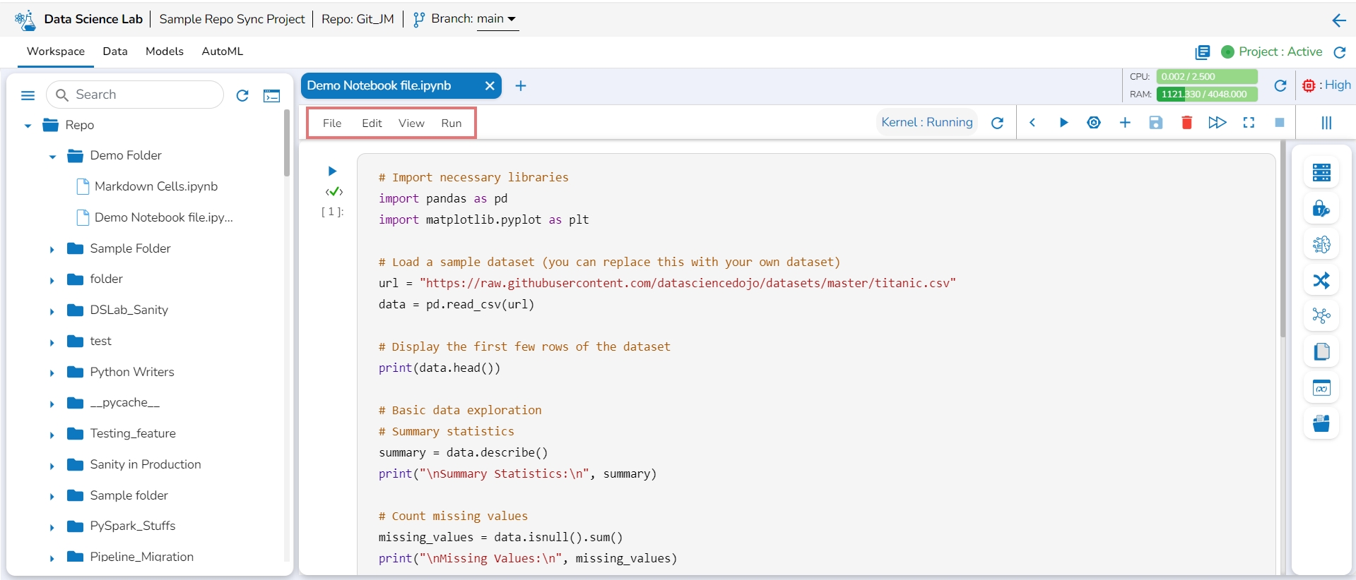 A taskbar has been provided on the top left of the Data Science Notebook screen to perform various tasks quickly.
