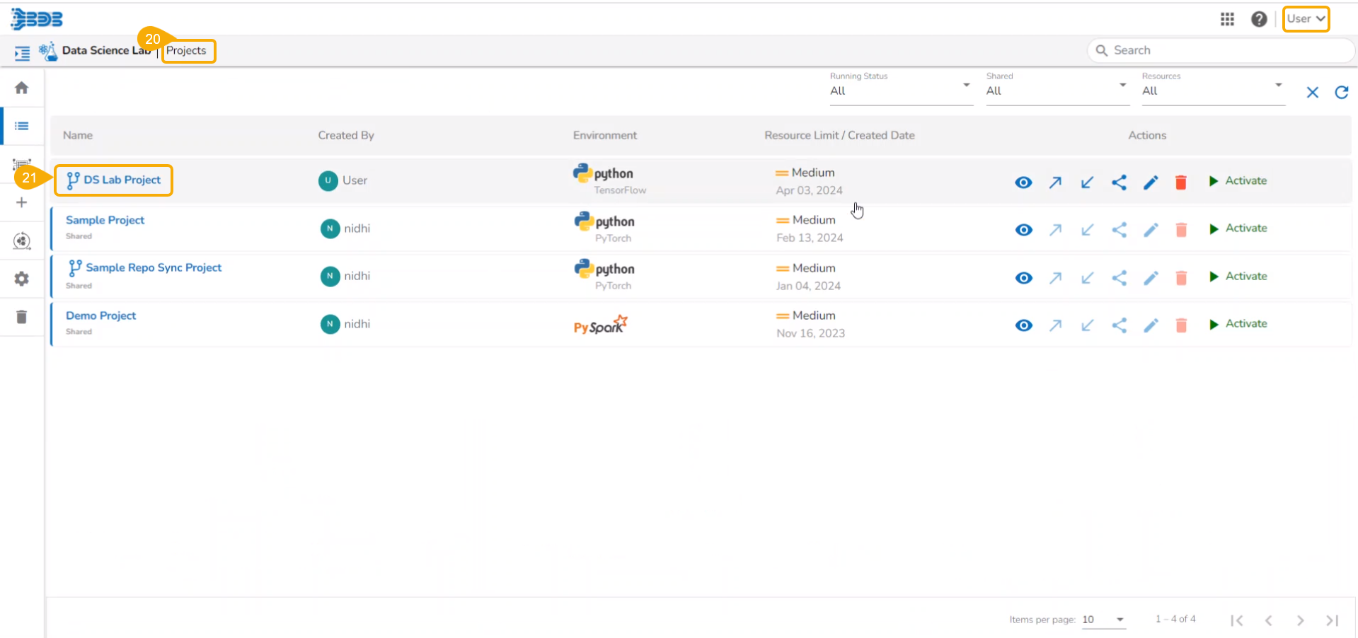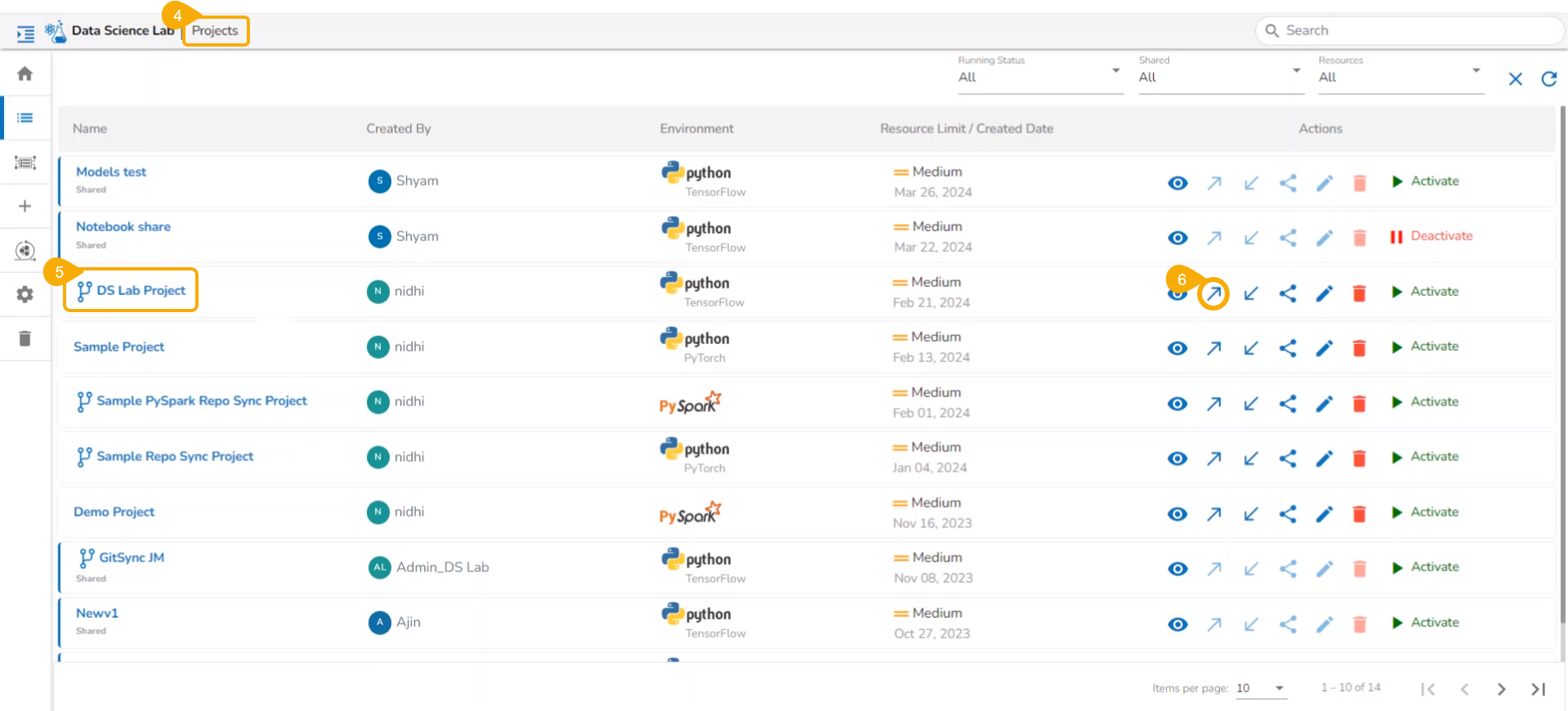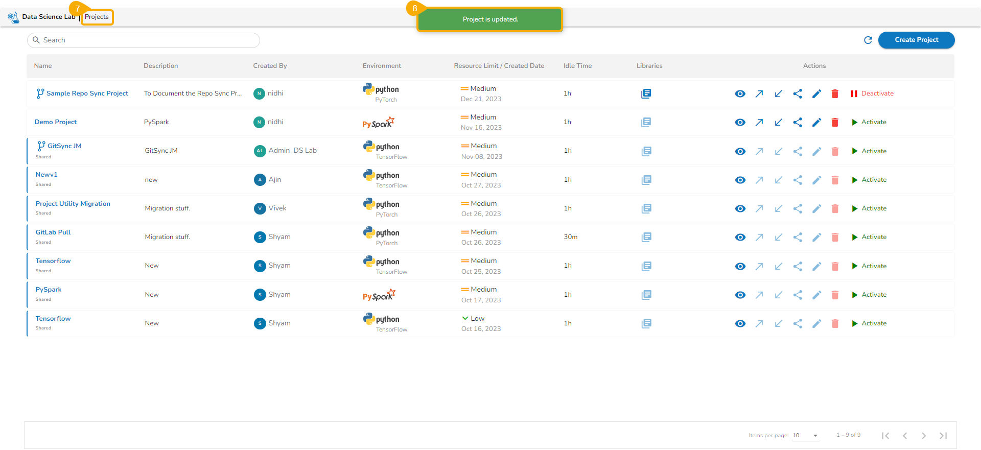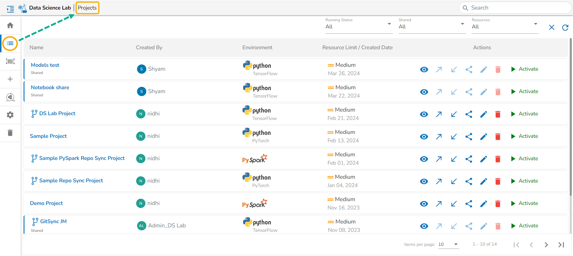 All the created Data Science Lab projects by the logged-in user get listed under this page with various Actions to be applied to them.