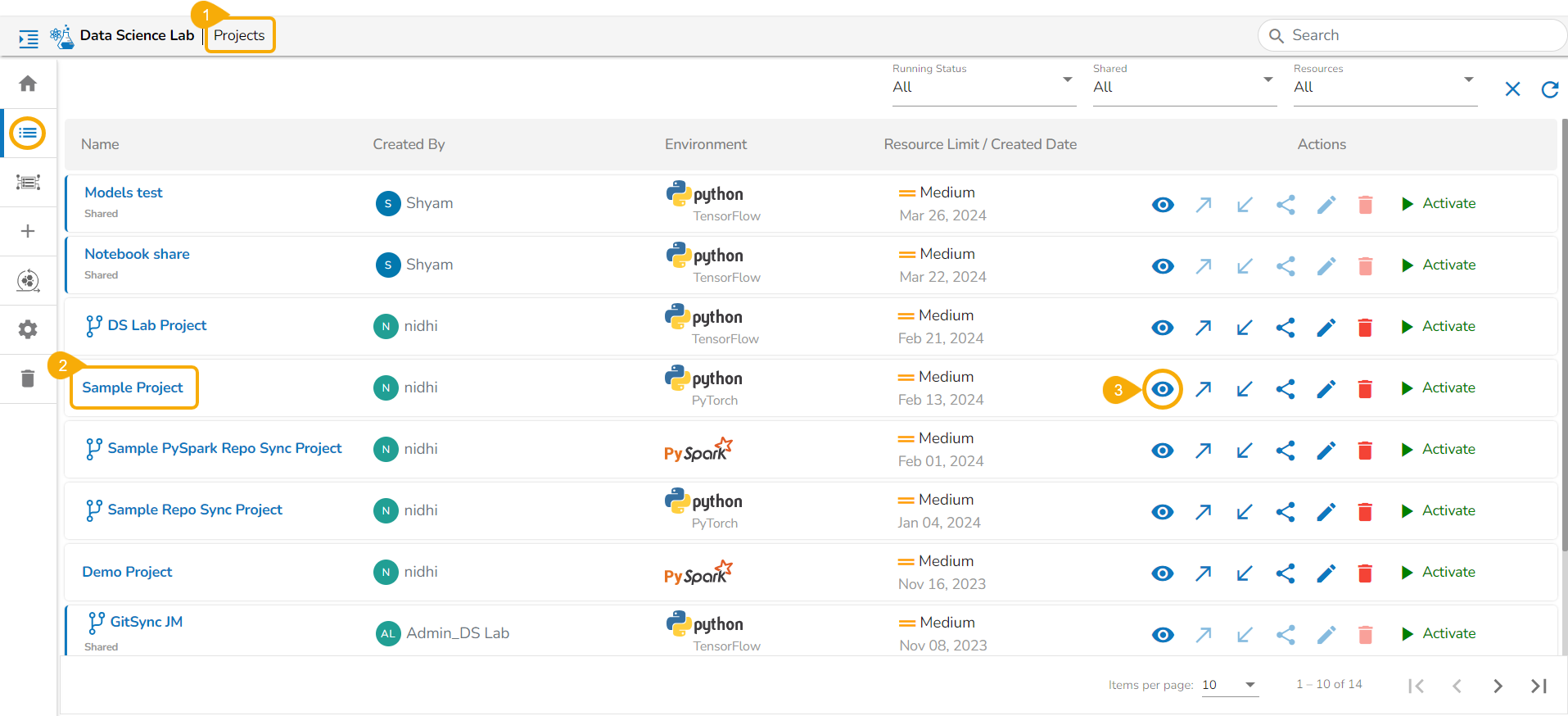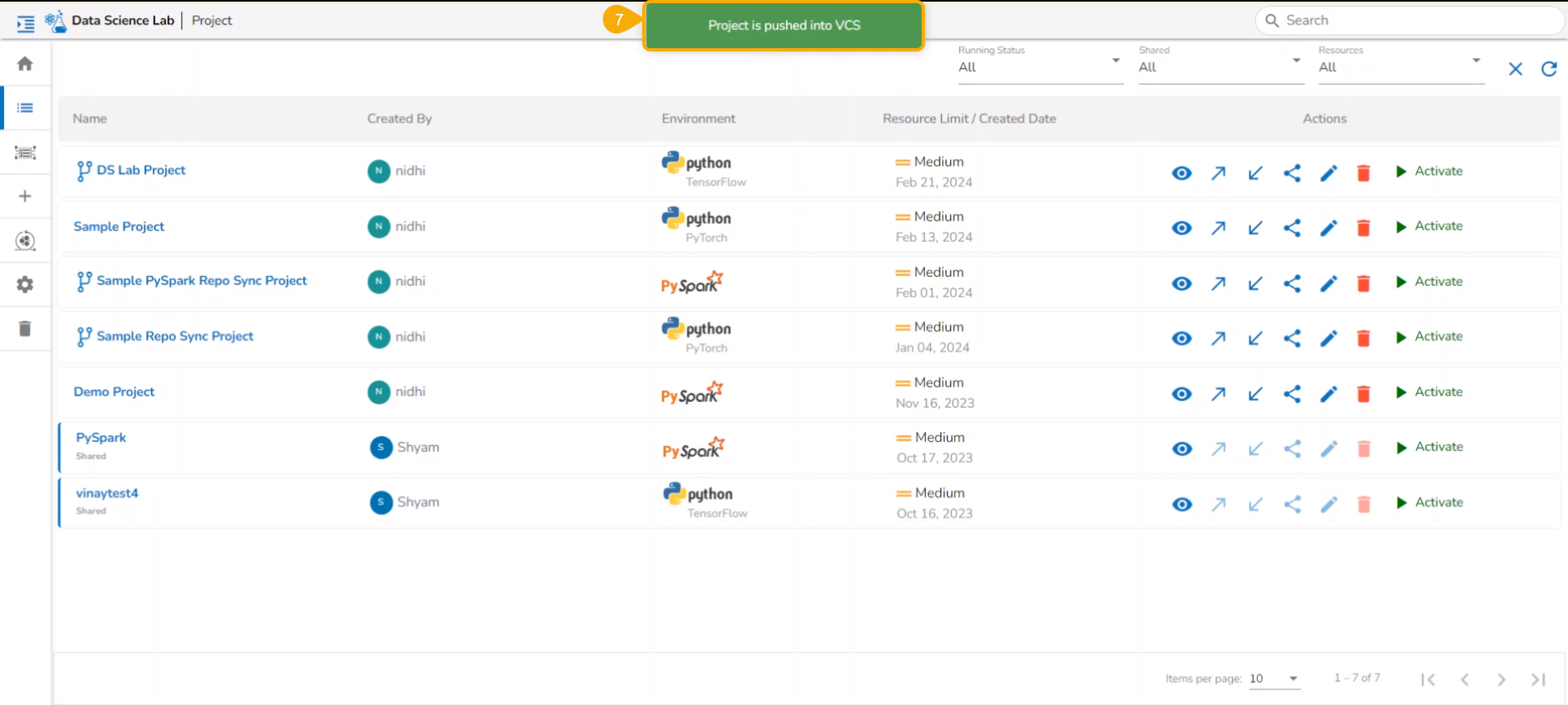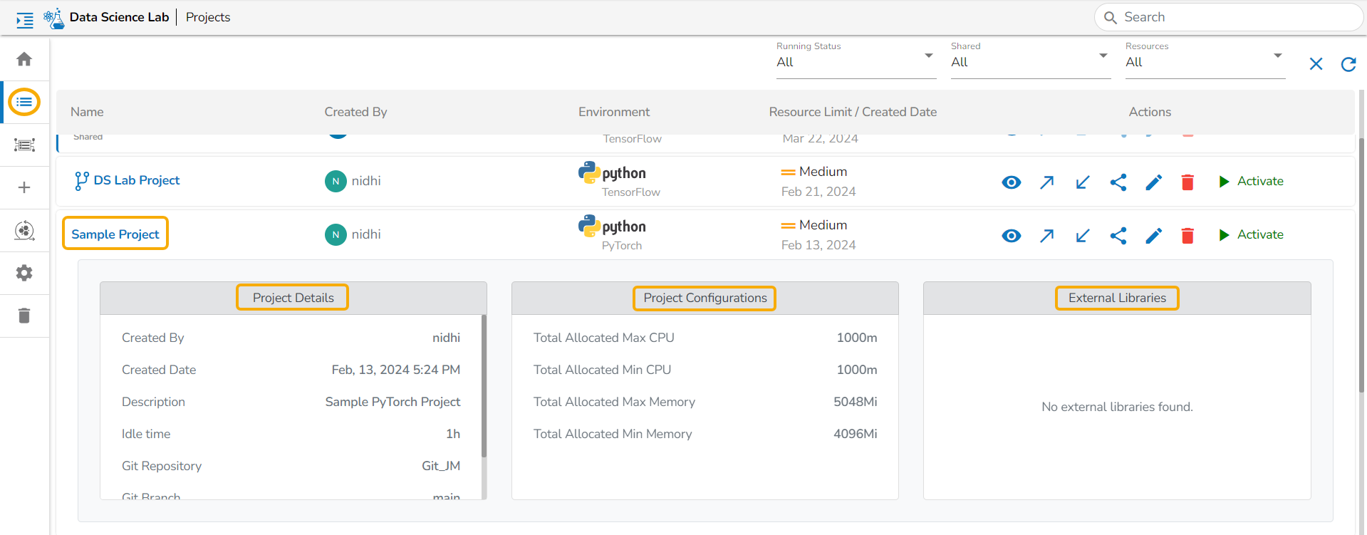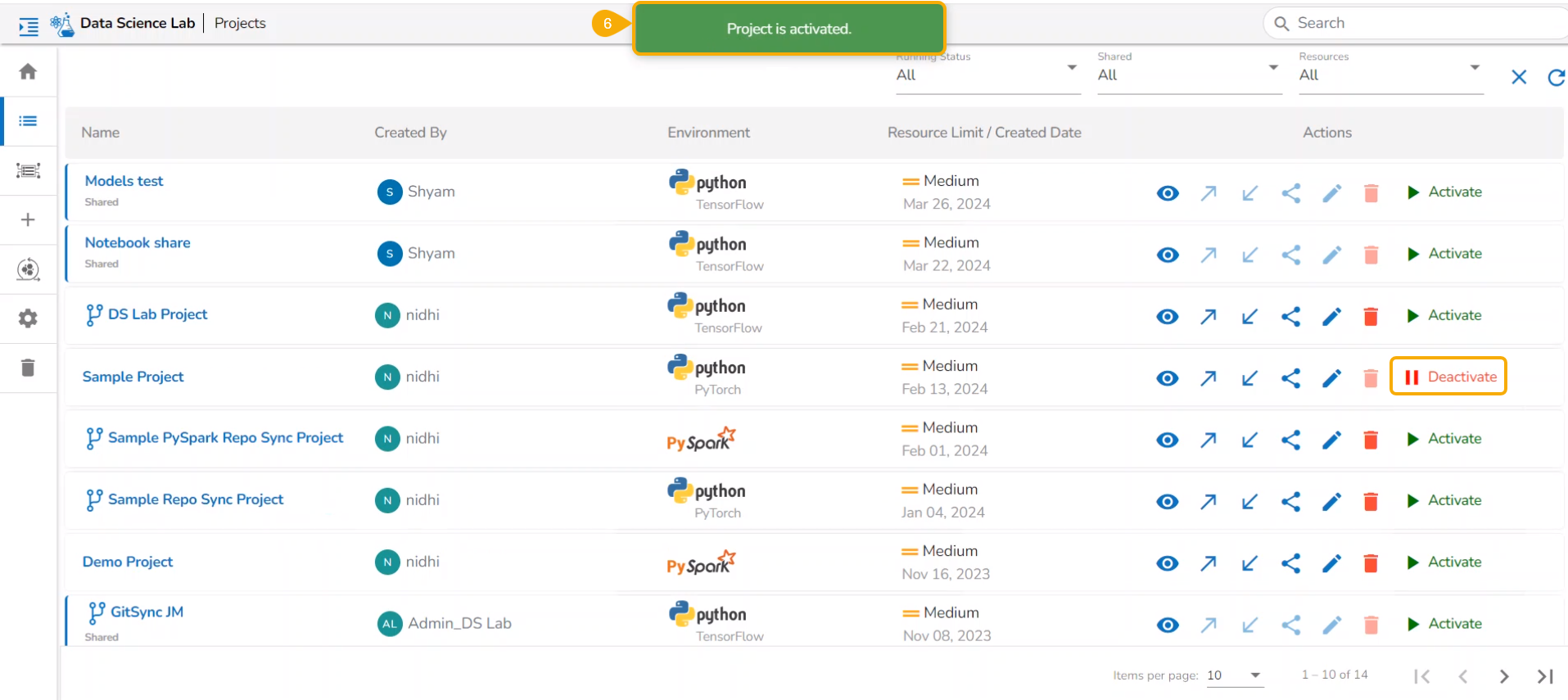 All the created Data Science Lab projects by the logged-in user get listed under this page with various Actions to be applied to them.