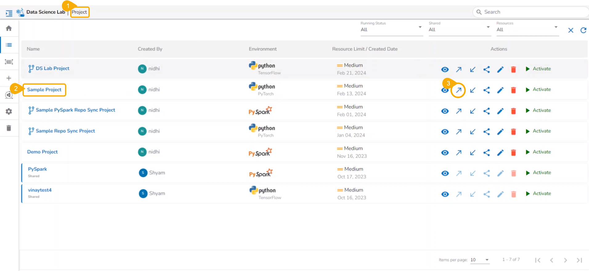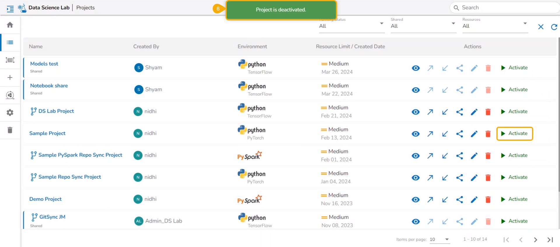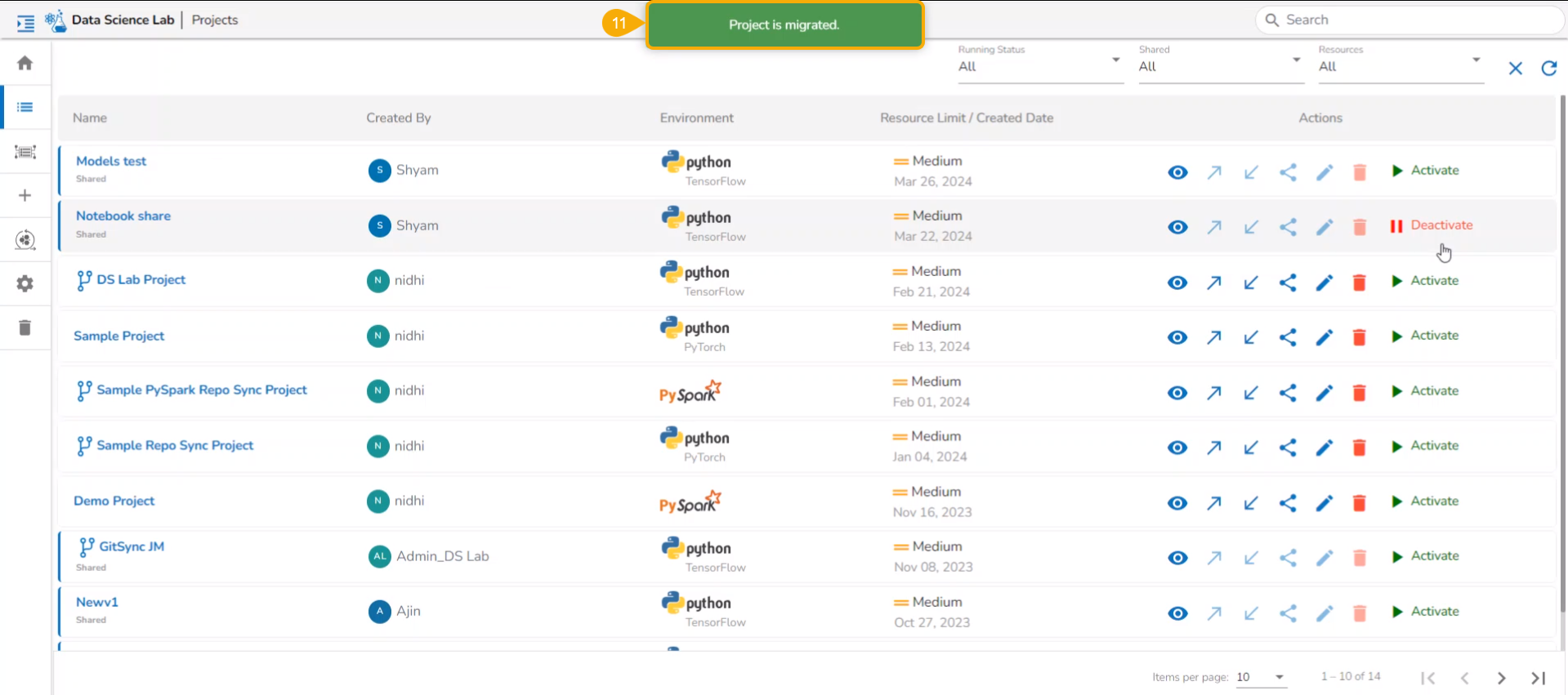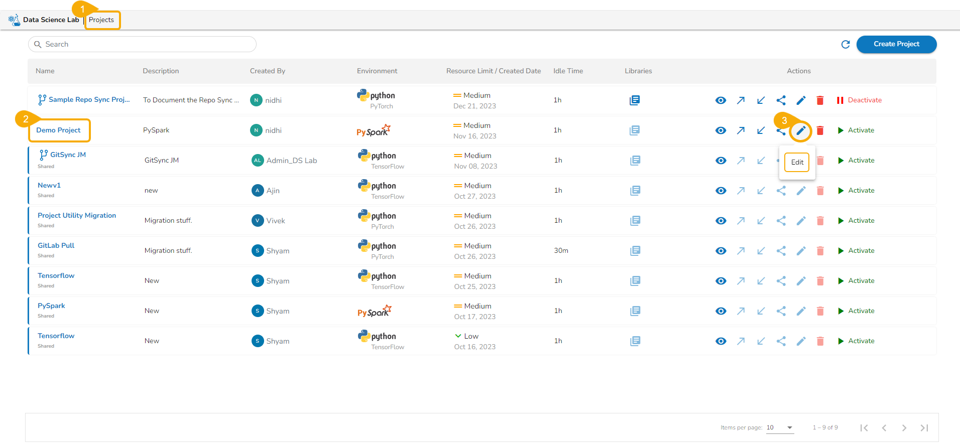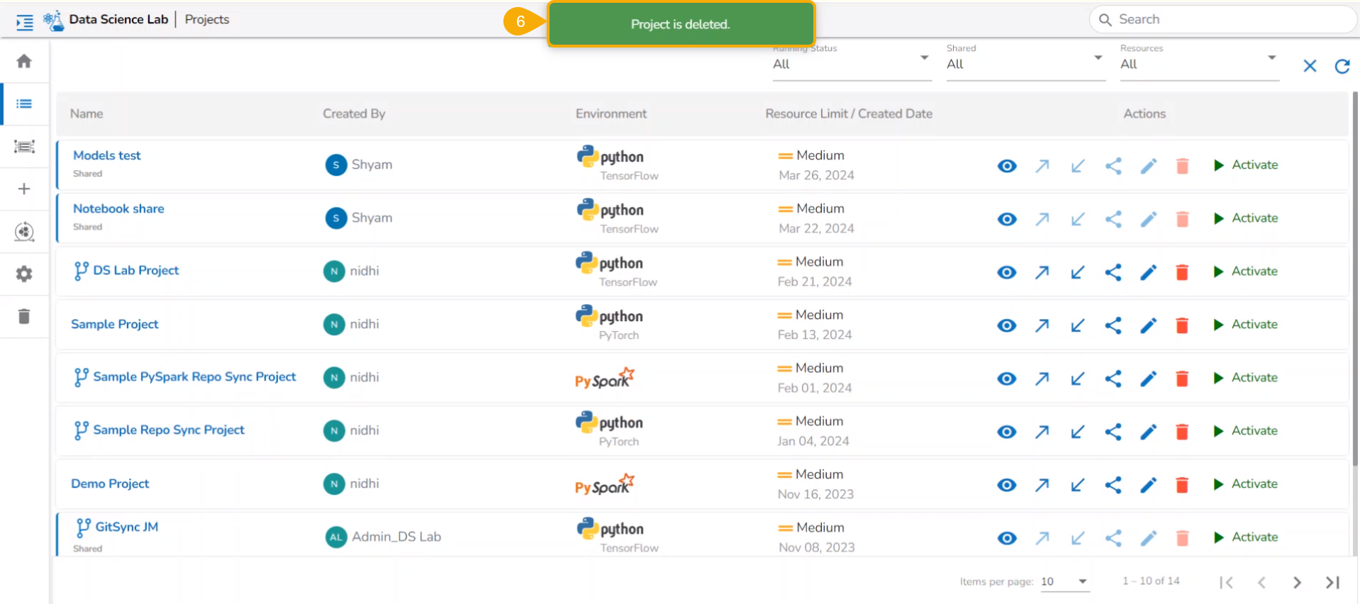 All the created Data Science Lab projects by the logged-in user get listed under this page with various Actions to be applied to them.