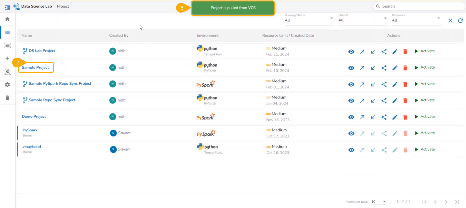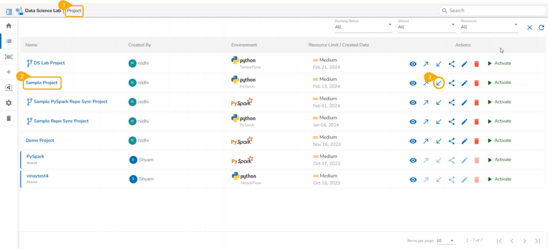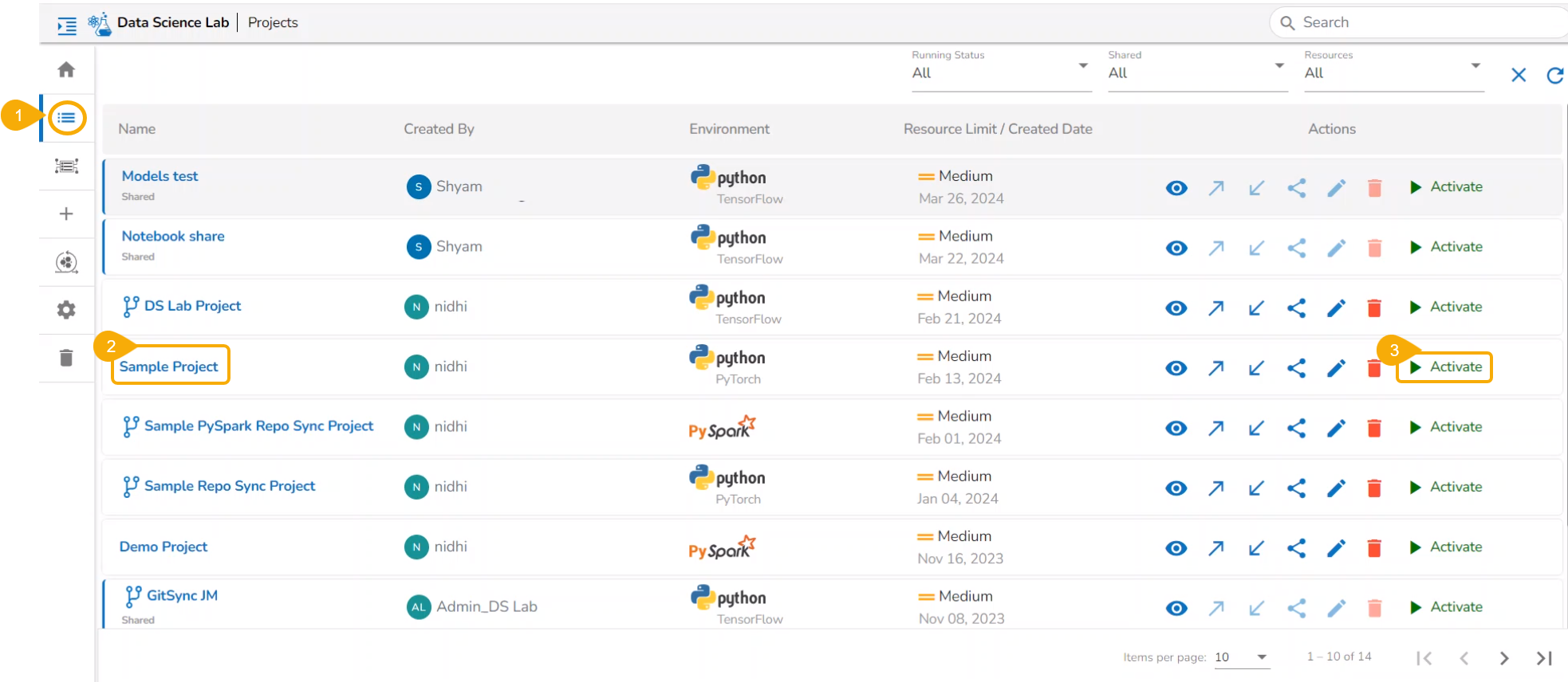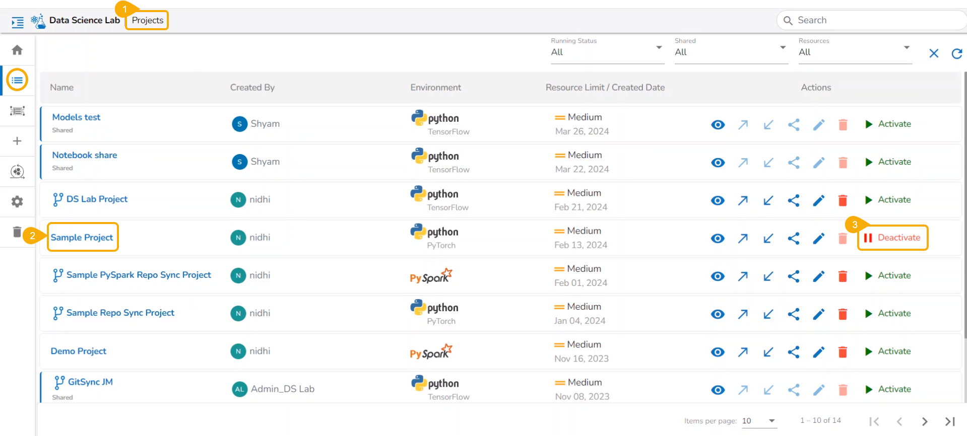 All the created Data Science Lab projects by the logged-in user get listed under this page with various Actions to be applied to them.