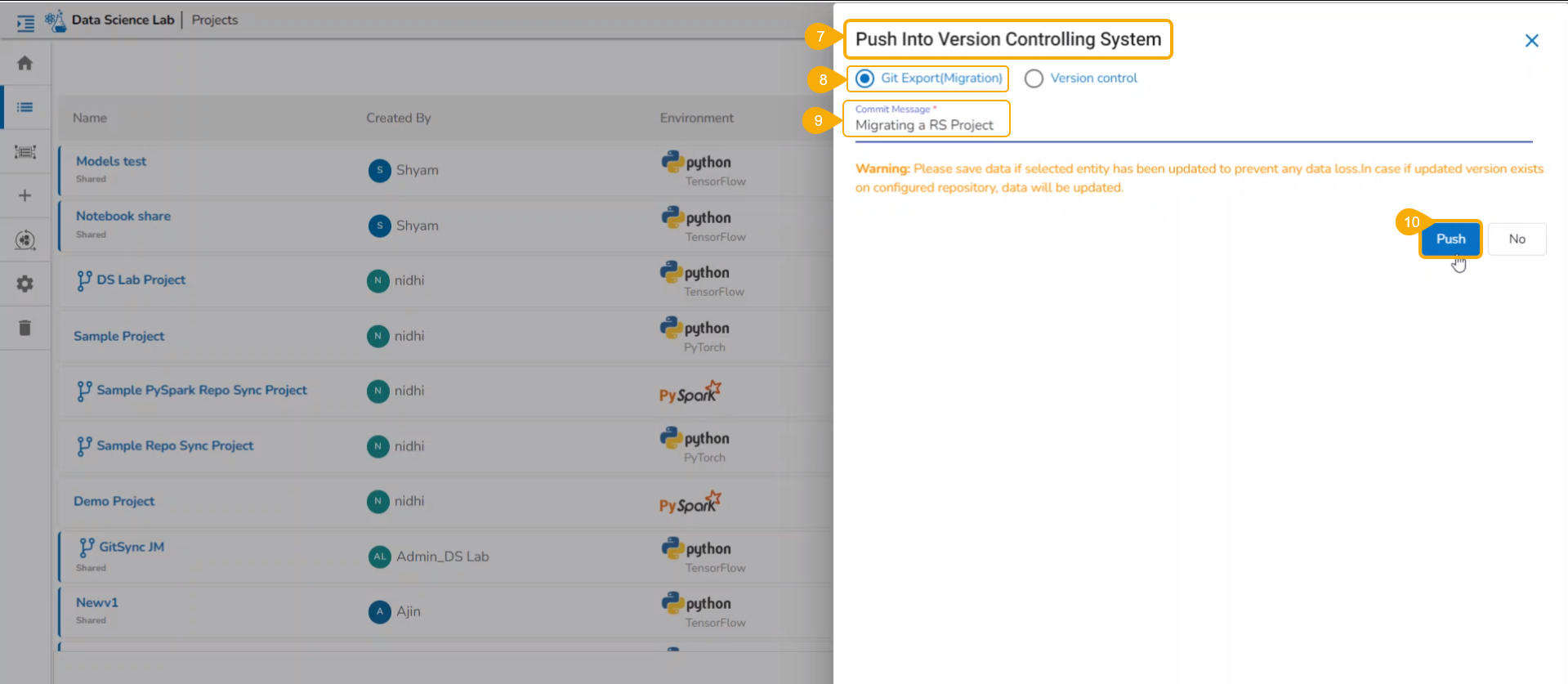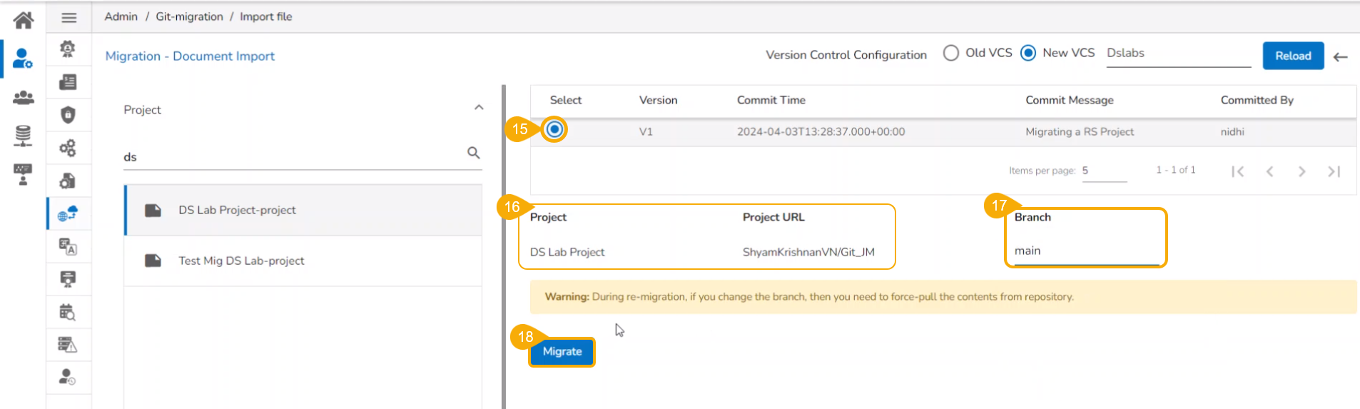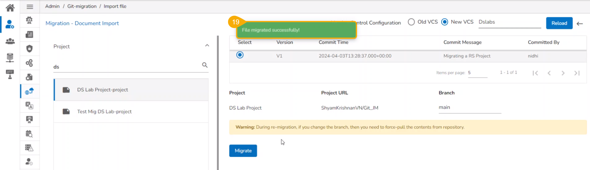 Please Note: Make sure all the changes made in your local system to a Repo Sync Project should be committed and pushed to the selected remote Git branch before initiating the Migration process.