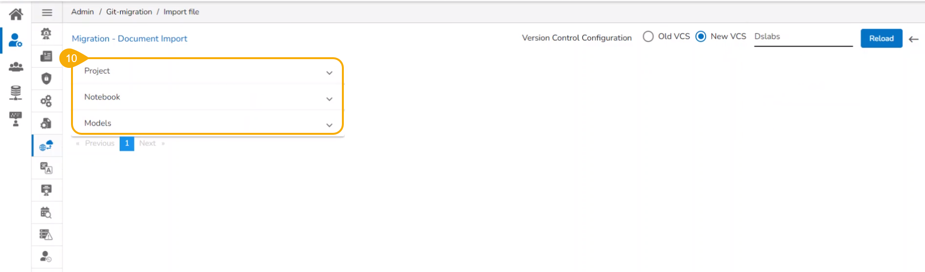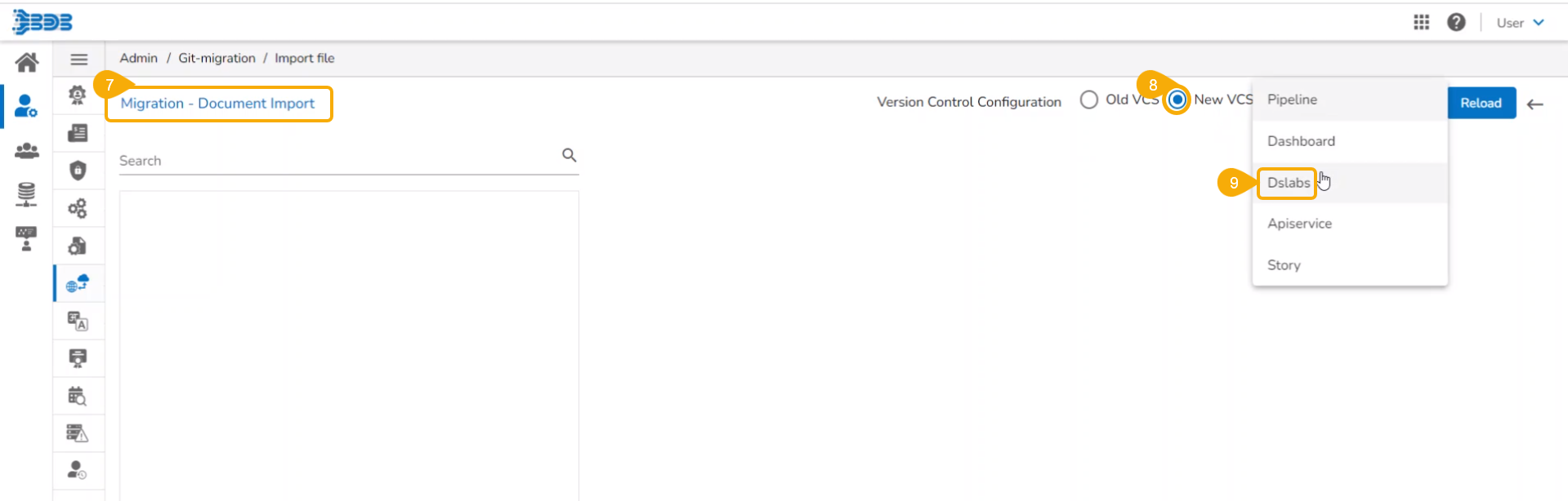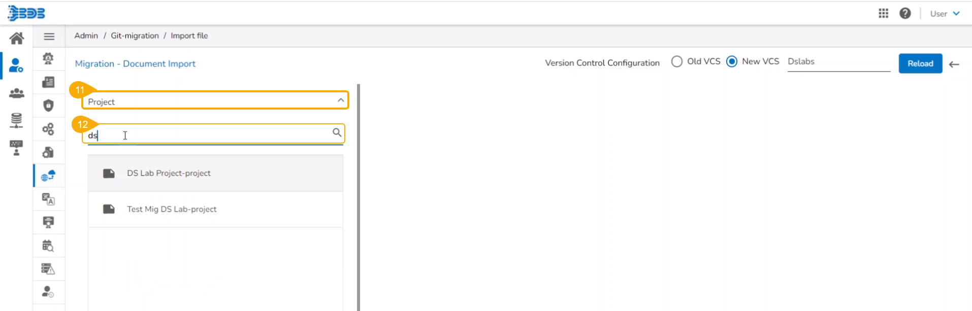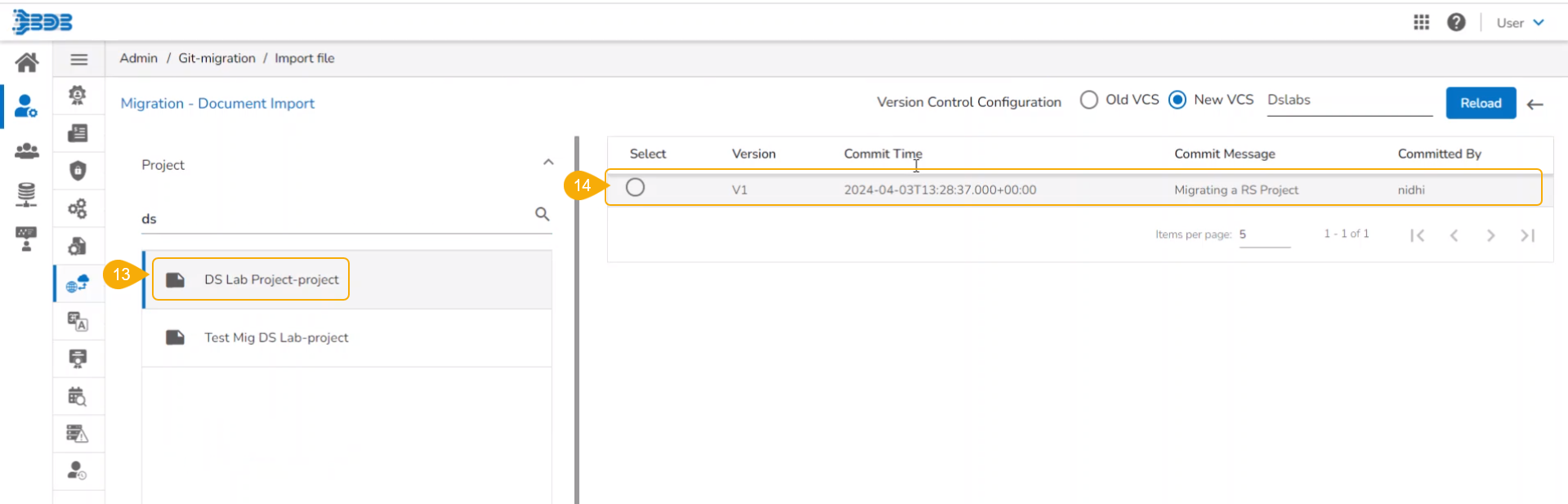 Please Note: The DS Lab module appears as Dslabs on the Import File page. Use the Search bar to search for a specific Project from the displayed list. Click the Project from the list. Available versions of the selected Project appear on the right side of the page.
