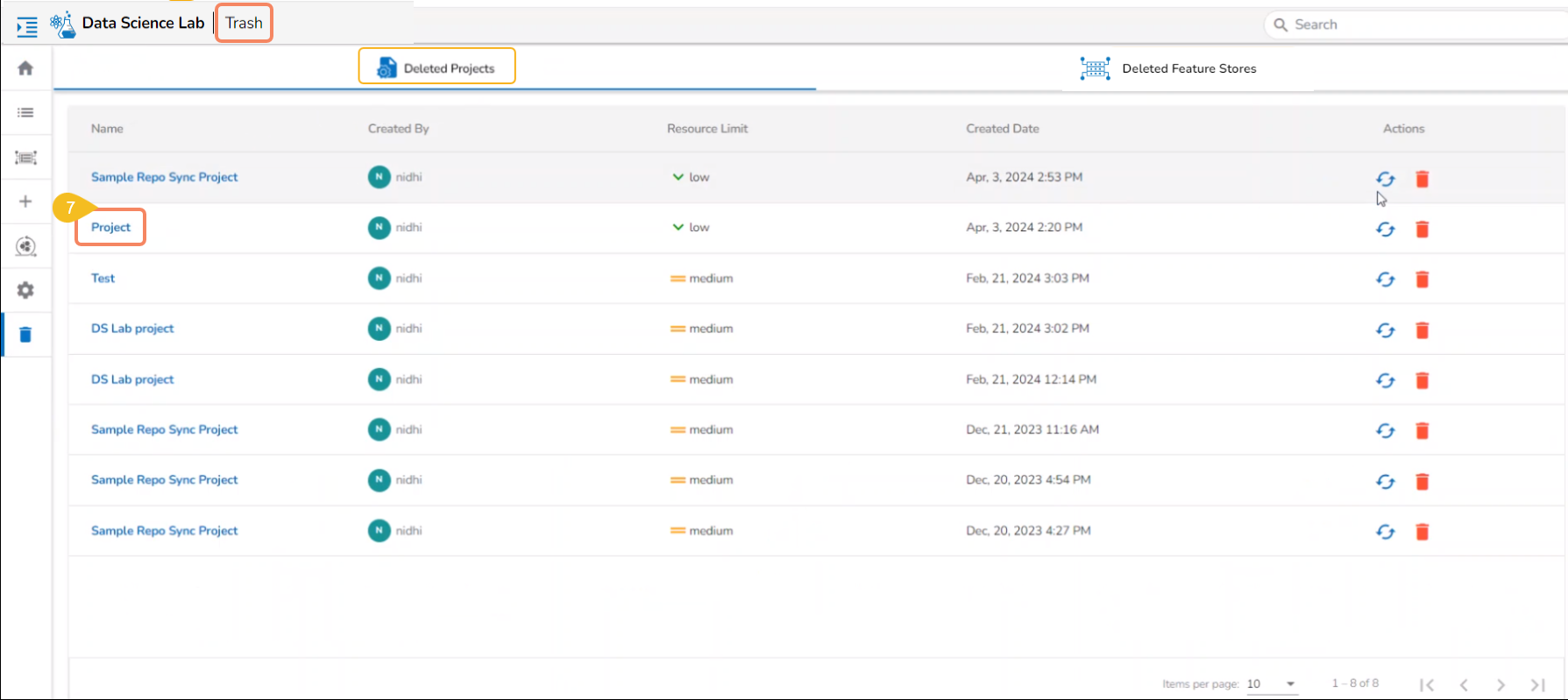 The deleted project will be moved to the Trash page. The user can restore it or delete it permanently from this page.