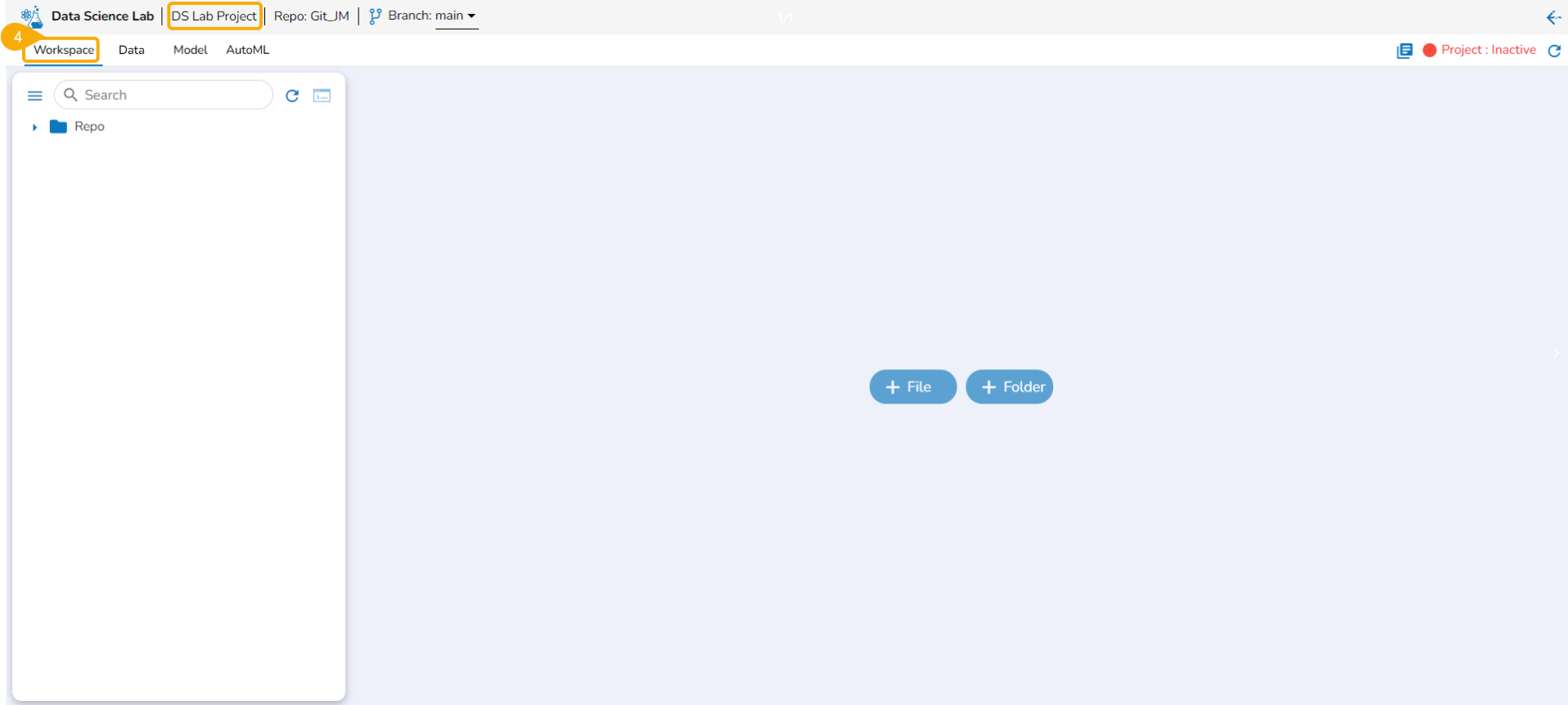 The Workspace tab opens by default for a Data Science Lab project while opening any project.