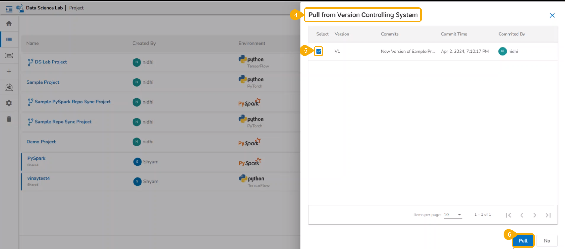 The pulled version of the selected Project gets updated in the Project list.