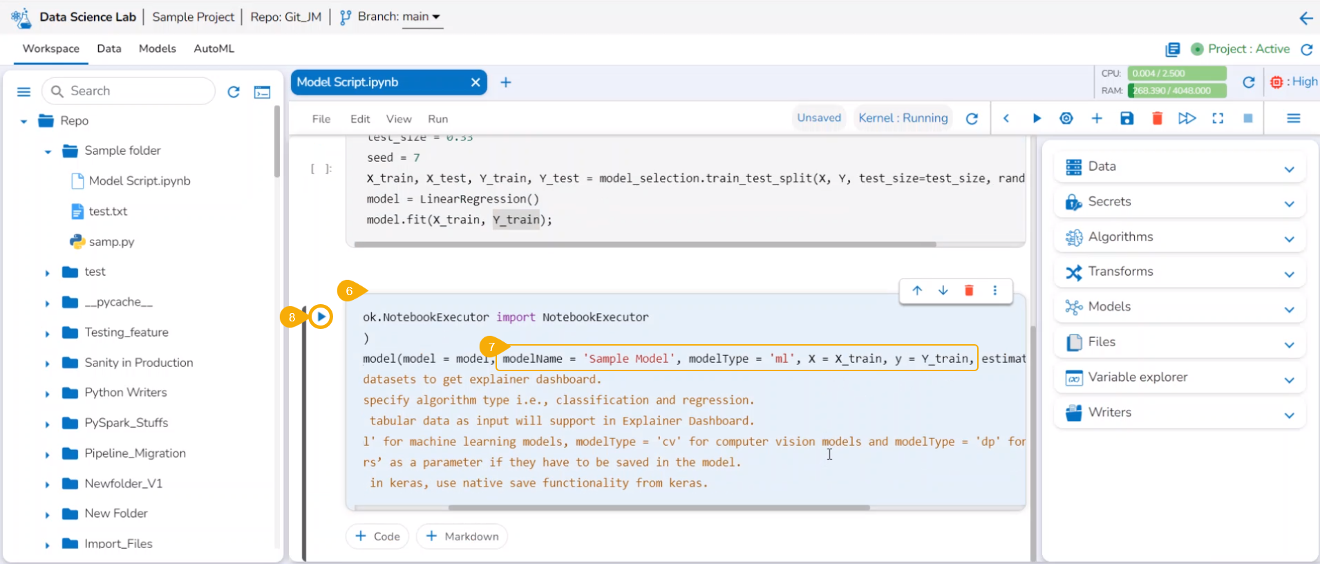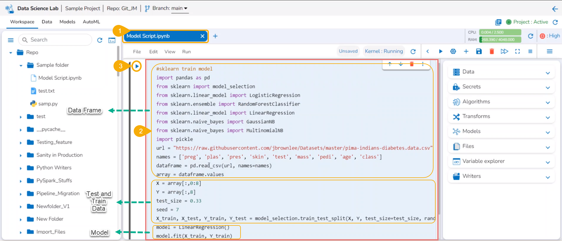 <figure><img src="https://content.gitbook.com/content/28ipFzCz8EMtVtHrBFLx/blobs/AnDxiEadWi4jS5TzQDg9/image.png" alt=""><figcaption><p><em><strong>Sample Script for a Data Science Model</strong></em></p></figcaption></figure>