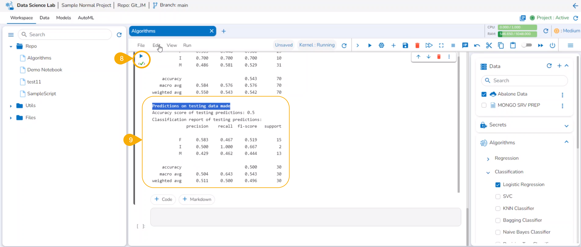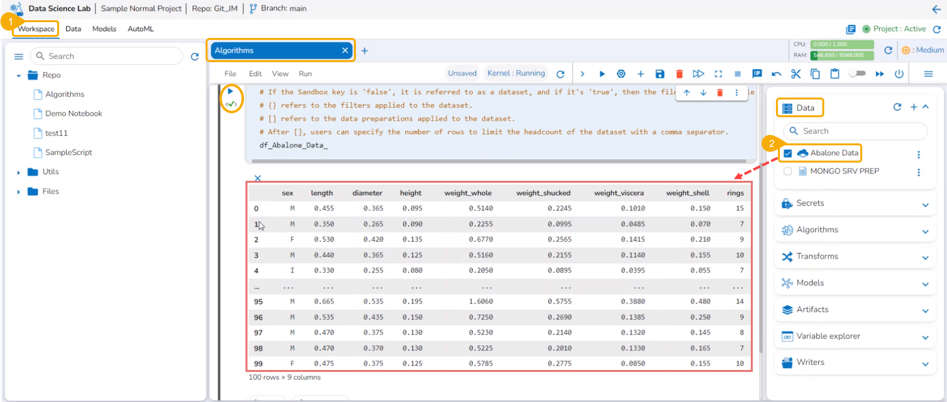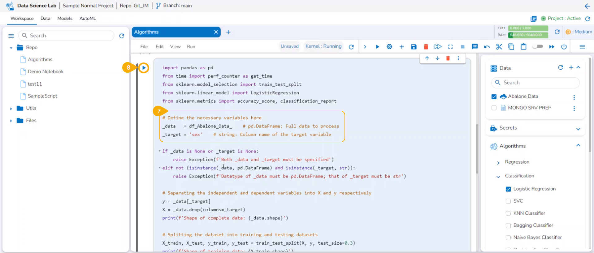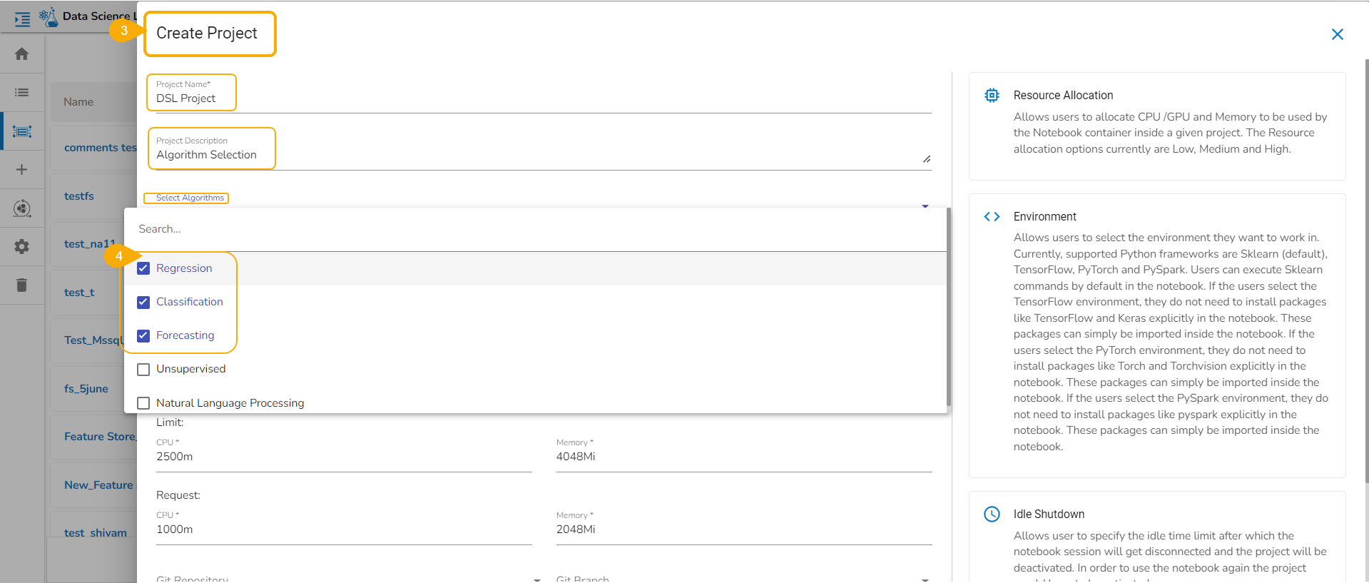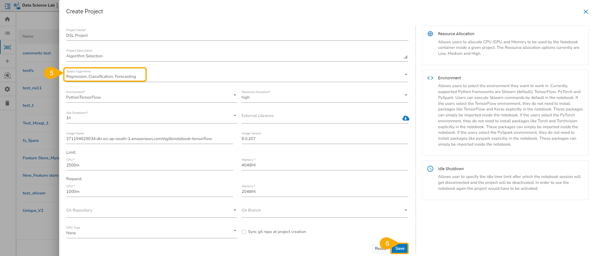Please Note: Once the Algorithm configuration is completed from the Admin and Project level the same set of Algorithms will be available for all the Notebooks which are part of that DSL Project.
