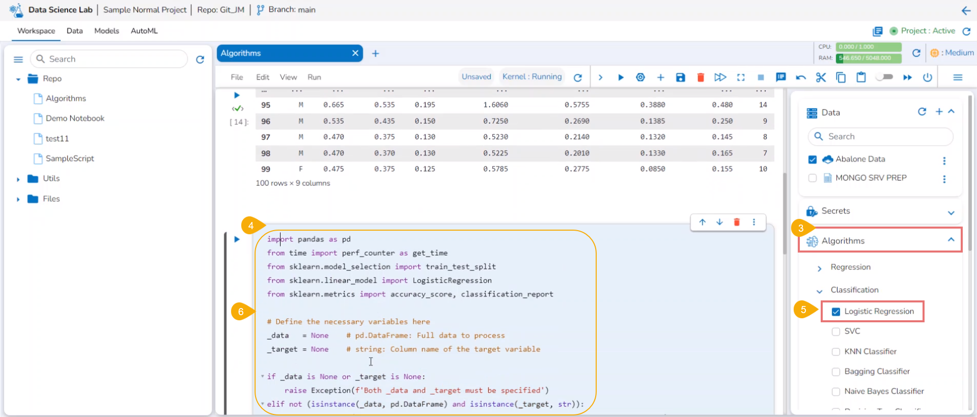 Once the Algorithm settings are configured in the Admin module, and the required Algorithms are selected while creating a Data Science Project, the user can access those Algorithms within a Notebook created under the same DSL Project.