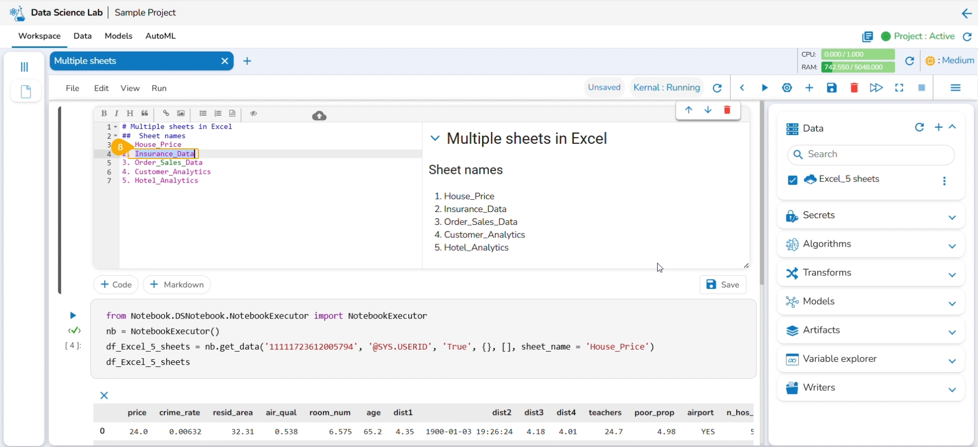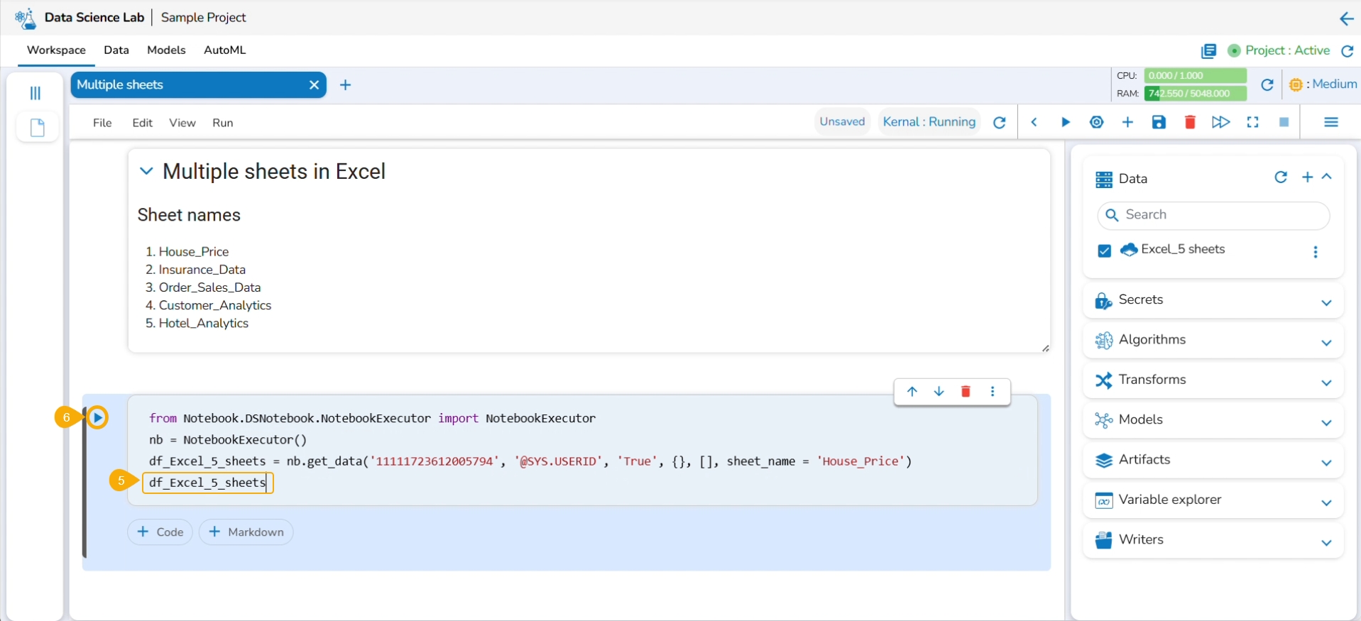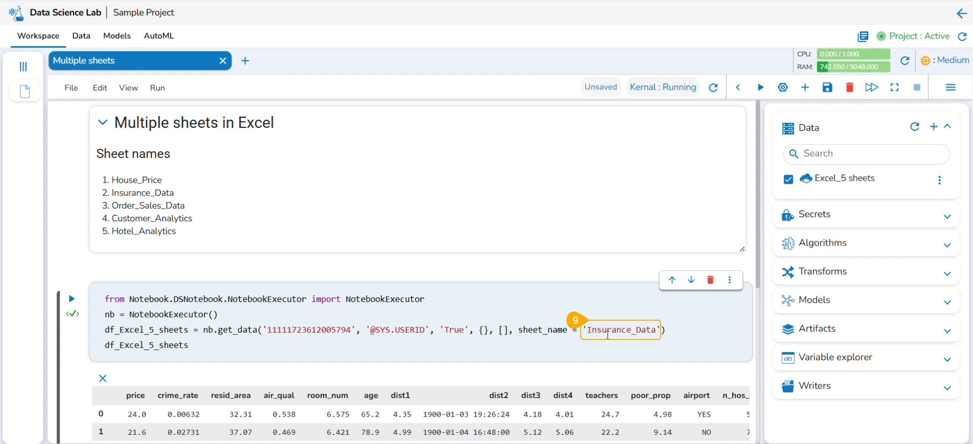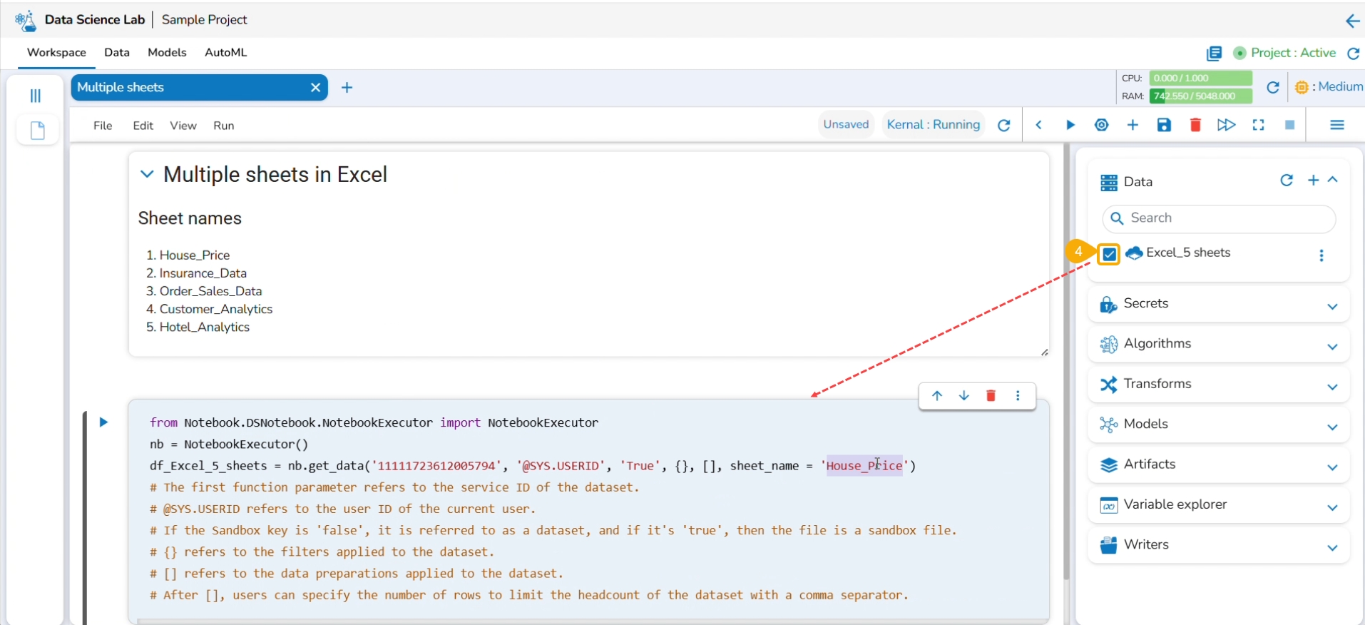 The Data Sets/ Sandbox files/ Feature Stores added to a Data Science Notebook will also be listed under the Data tab provided under the same project. Hence, the added datasets will be available for all the Data Science Notebooks created or imported under the same project.