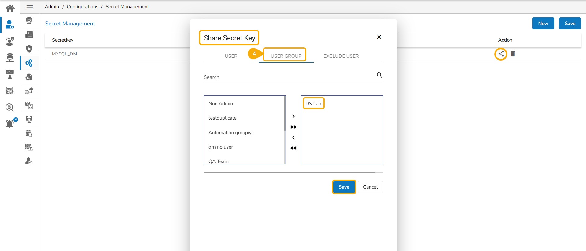 The configured Secrets must be shared with a user group to access it inside the Data Science Lab module.