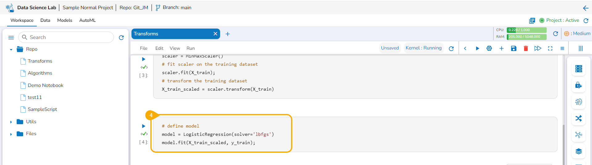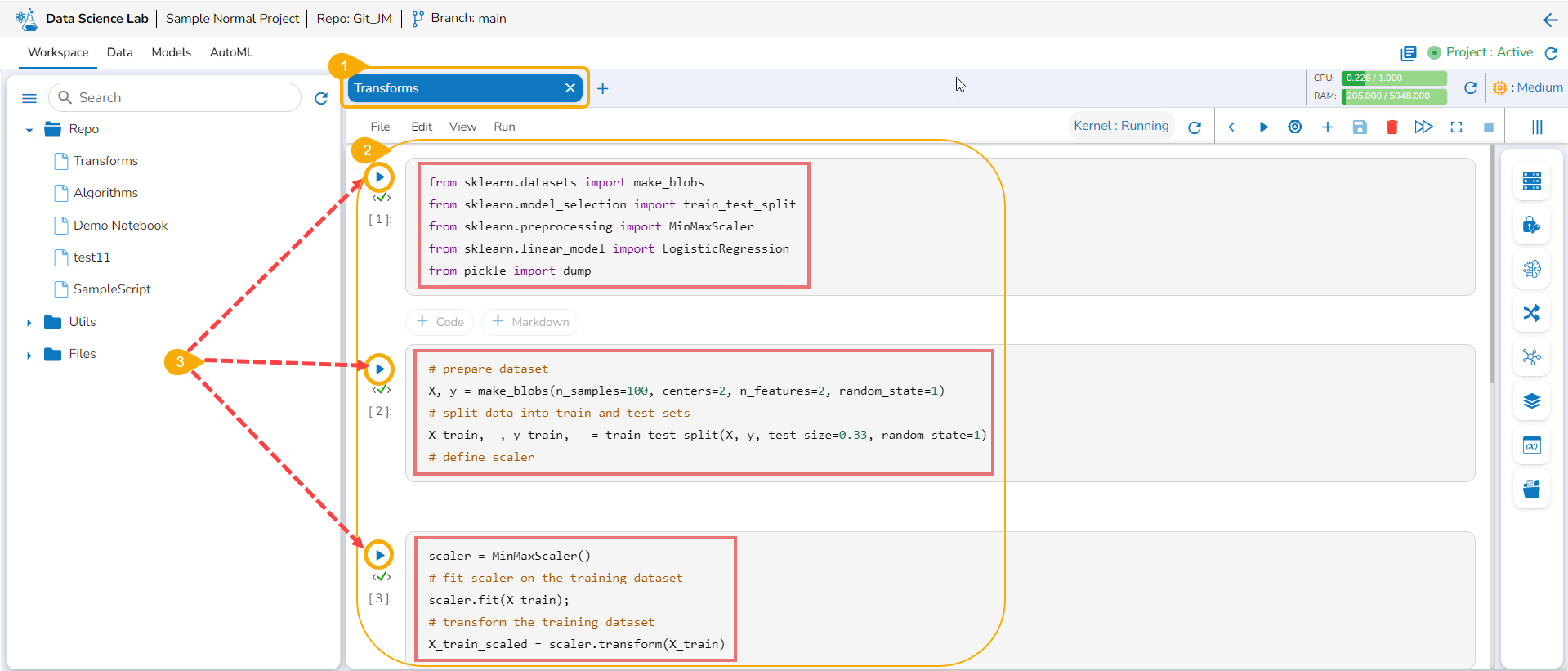 Add a Code cell. Write or provide a transform script to the cell (In this case, it has been supplied in three cells).