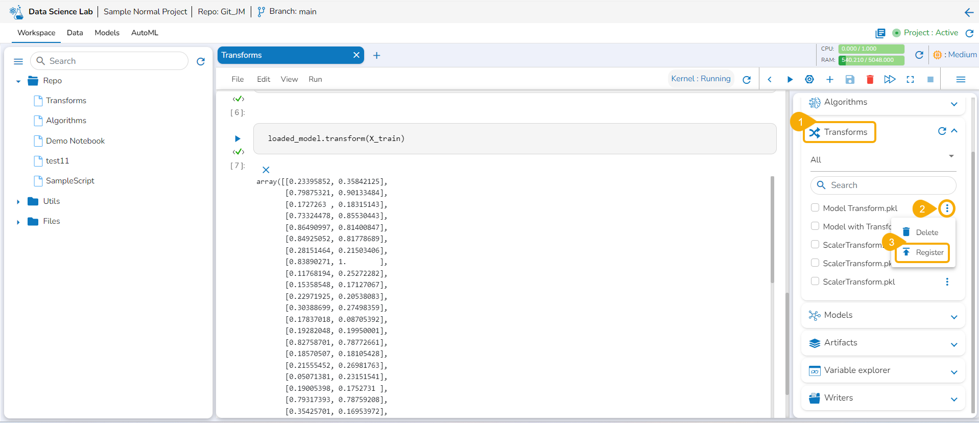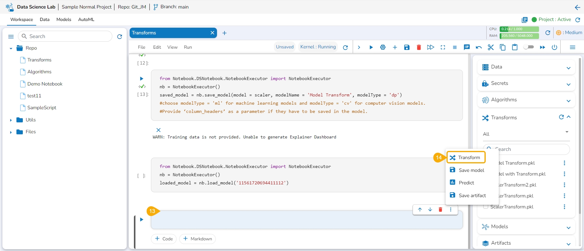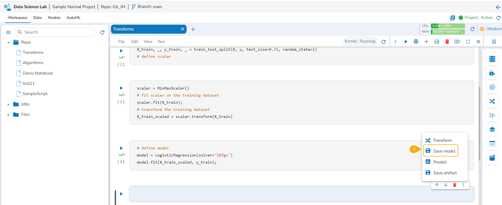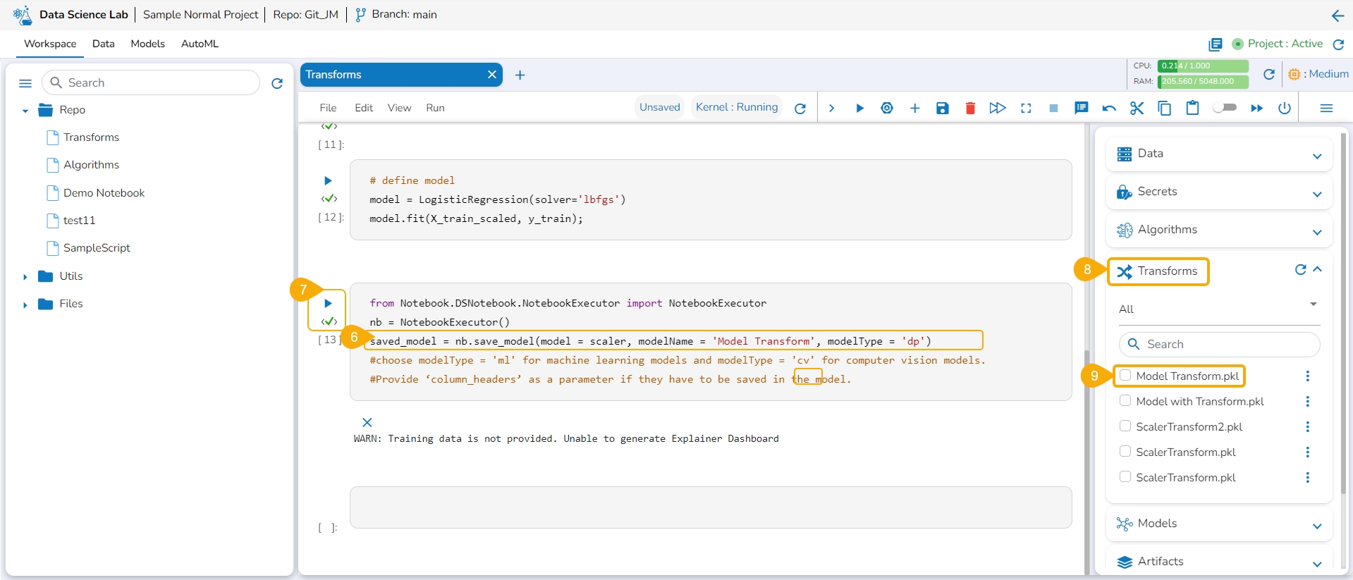 Save and load models with transform script, register them or publish them as an API through DS Lab module.