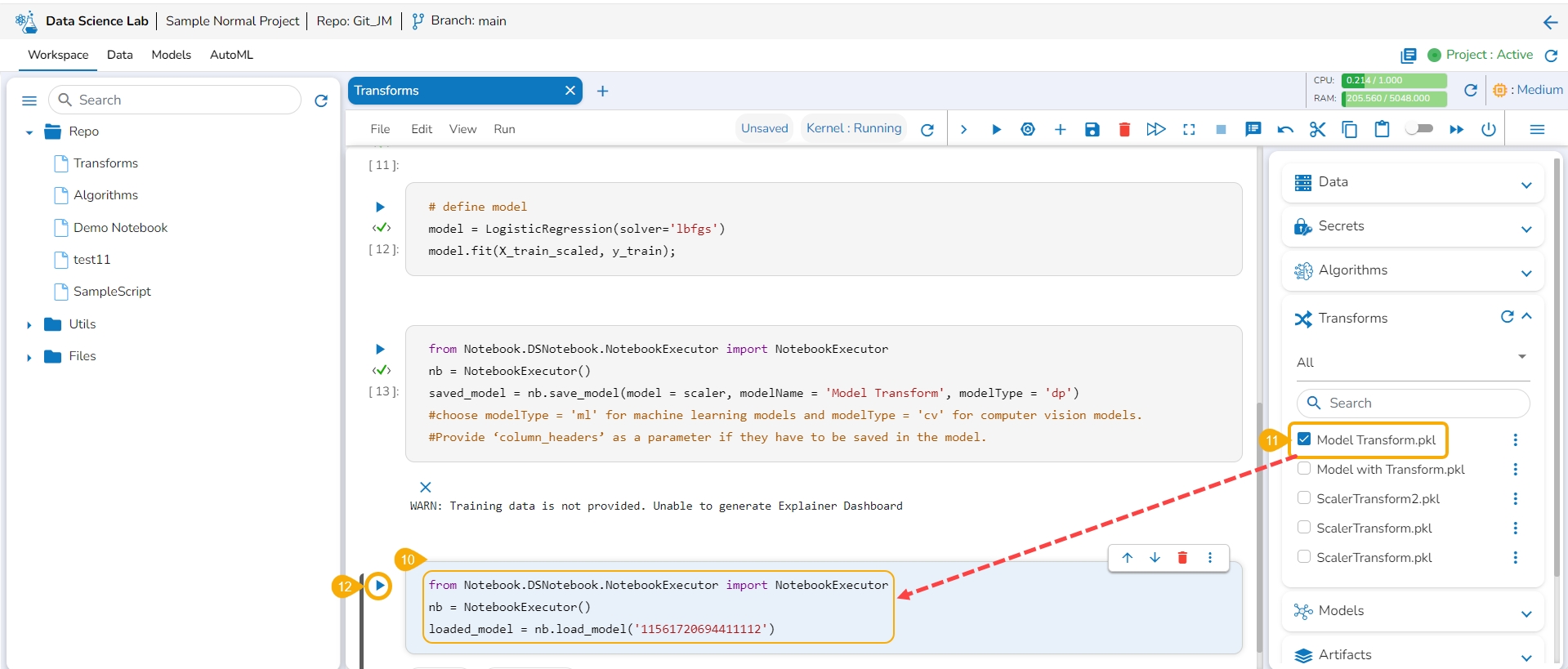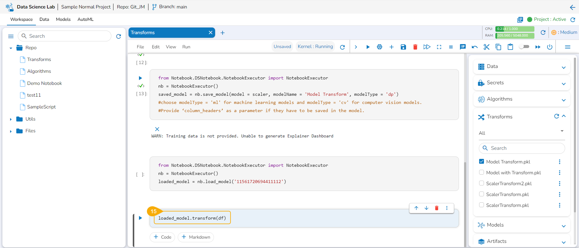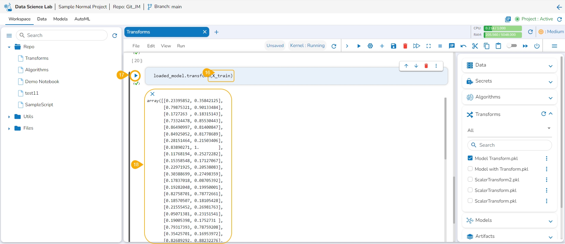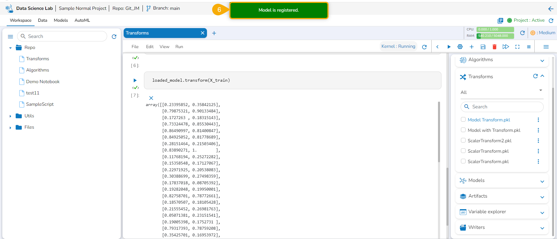 Save and load models with transform script, register them or publish them as an API through DS Lab module.