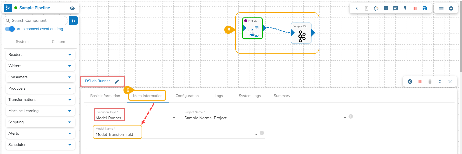 The registered model gets listed under the Meta Information tab of the DS Lab model runner component inside the Data Pipeline module.