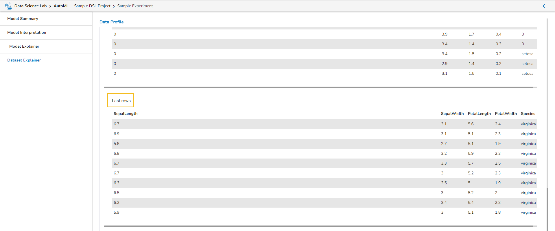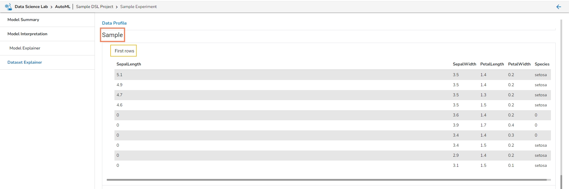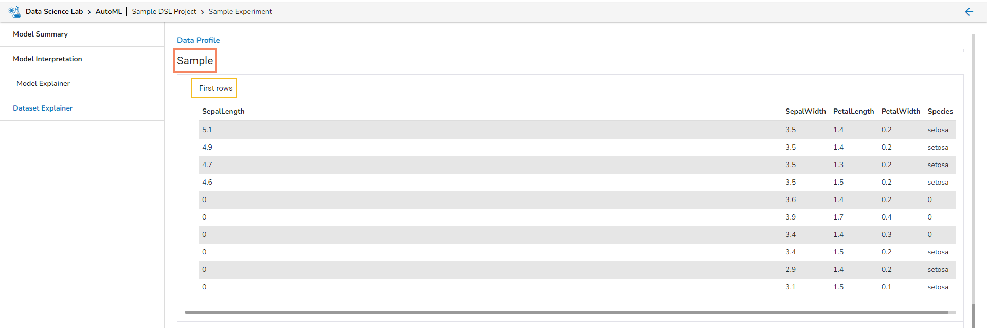 The Dataset Explainer tab provides a high-level preview of the dataset that has been used for the experiment. It redirects the user to the Data Profile page.