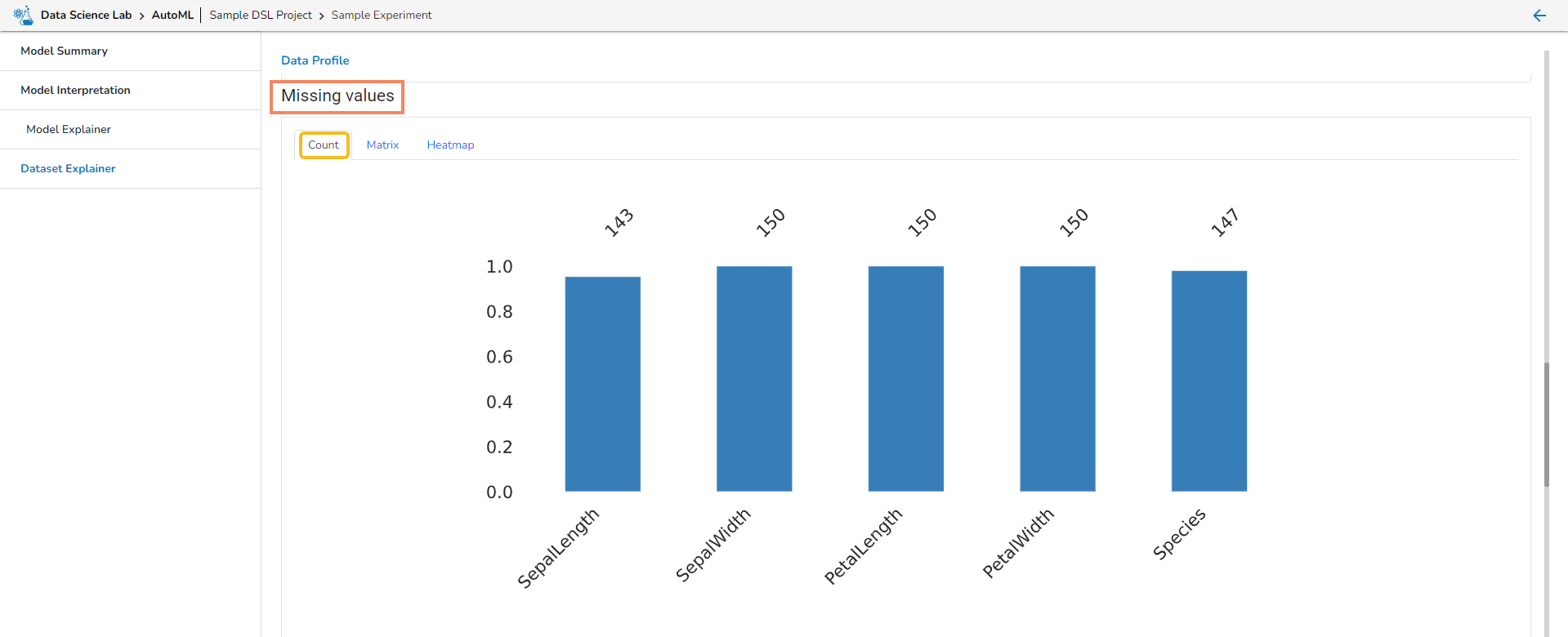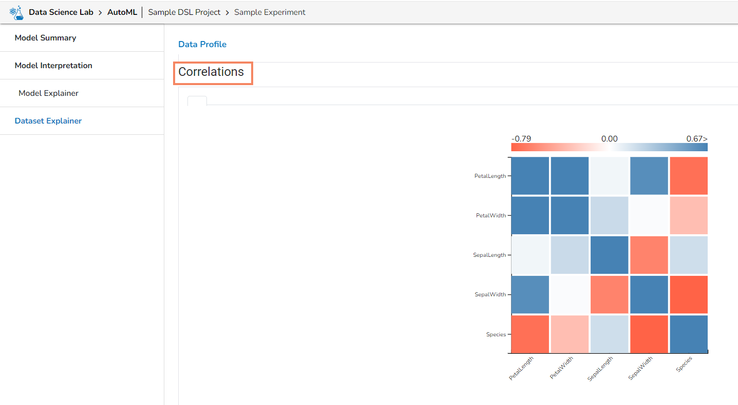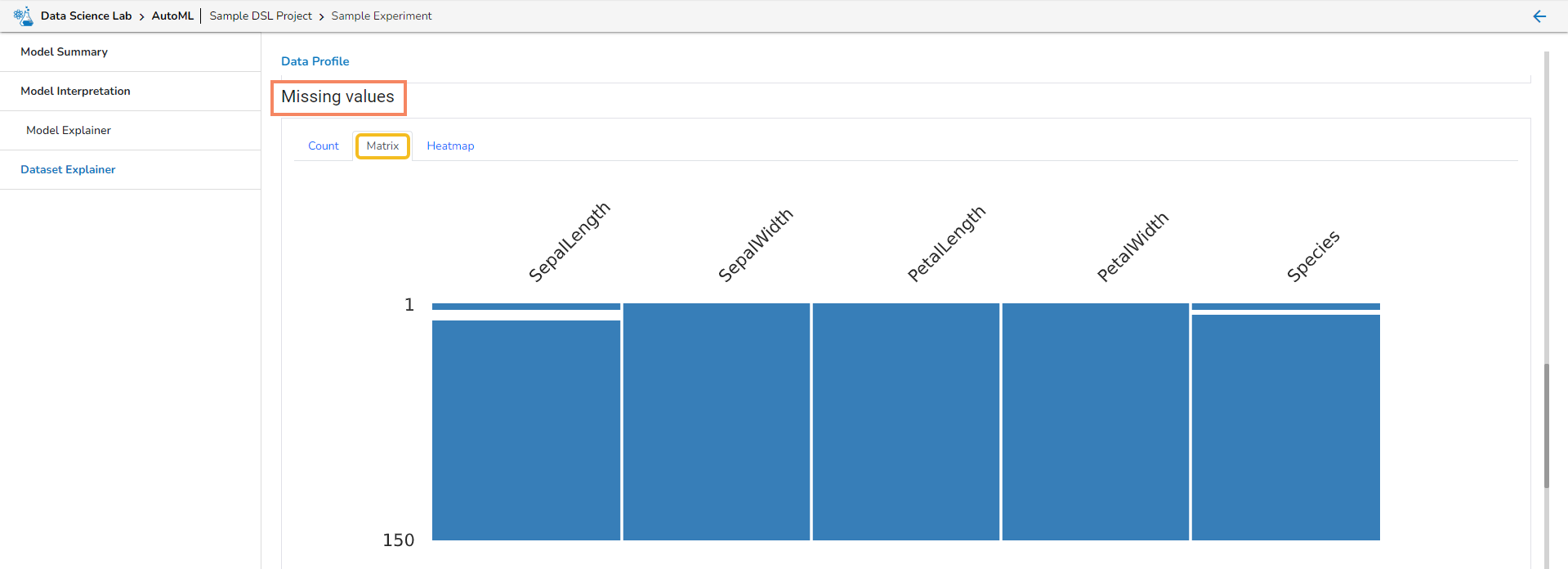 The Dataset Explainer tab provides a high-level preview of the dataset that has been used for the experiment. It redirects the user to the Data Profile page.