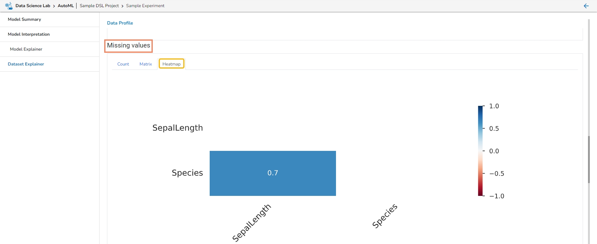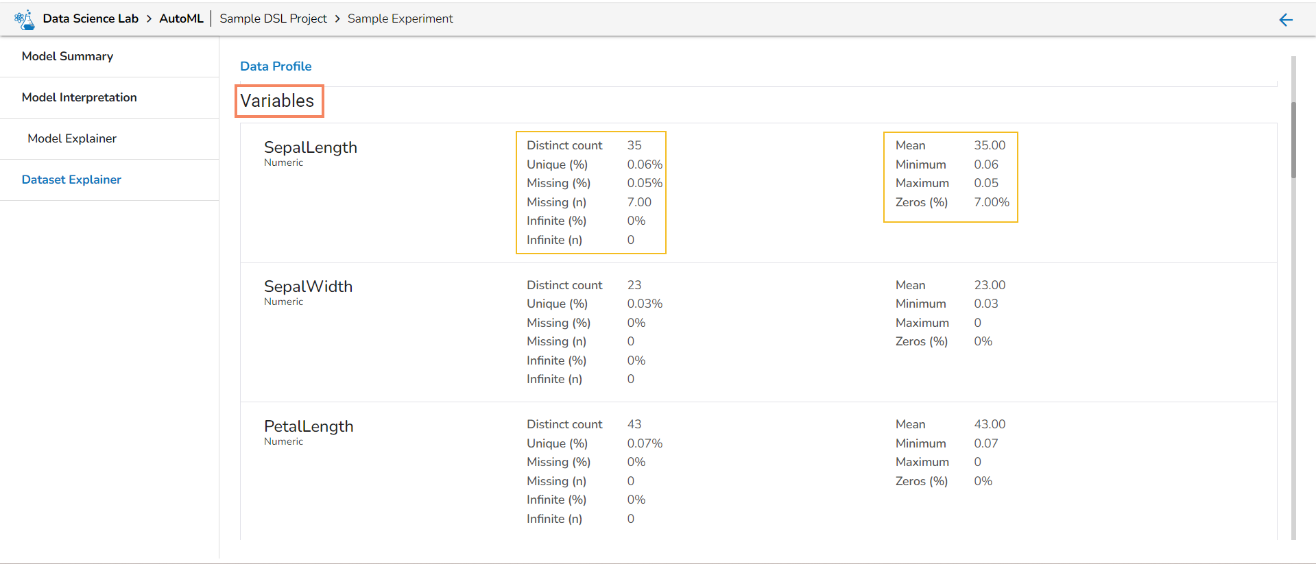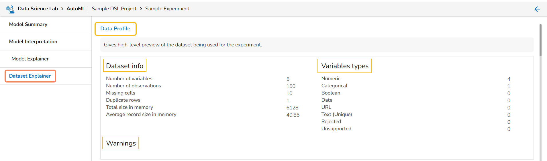 The Data Profile displayed under the Dataset Explainer section displays the following information for the Dataset.