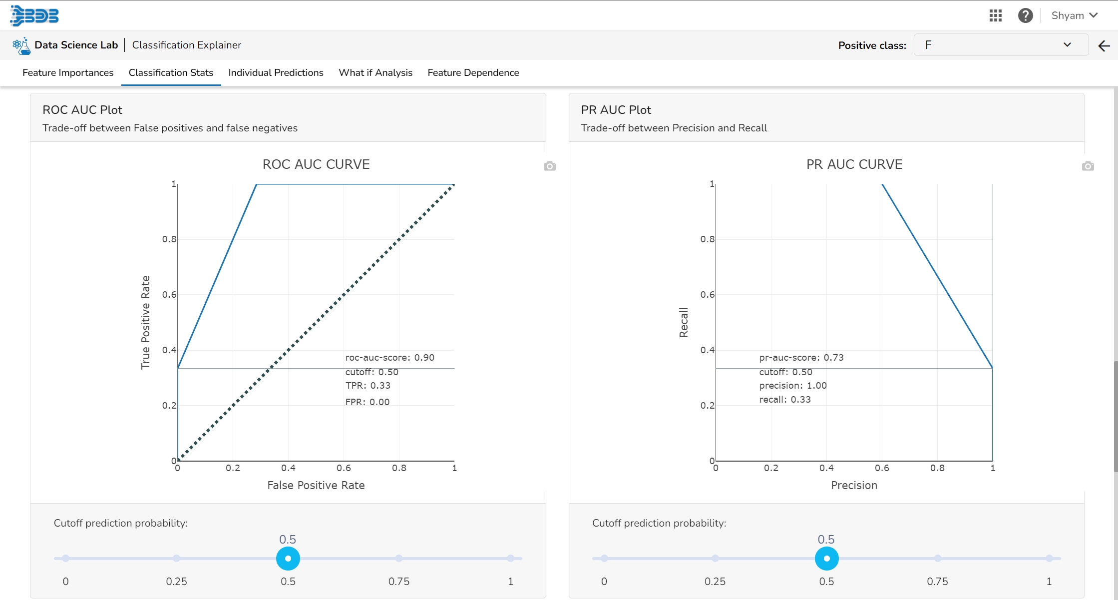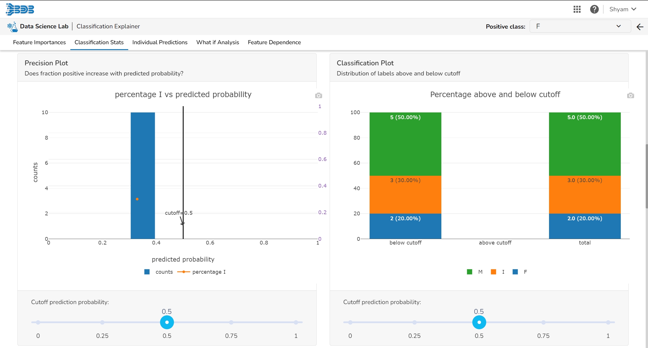 Select a model cutoff such that all predicted probabilities higher than the cutoff will be labeled positive and all predicted probabilities lower than the cutoff will be labeled negative. The user can also set the cutoff as a percentile of all observations. By setting the cutoff it will automatically set the cutoff in the multiple other connected components.