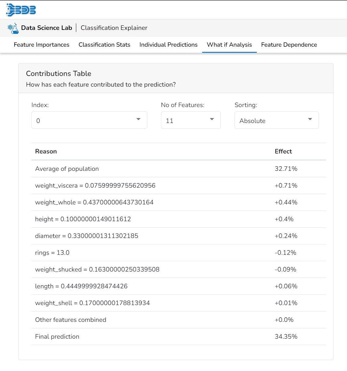 This table shows the contribution each individual feature has had on the prediction for a specific observation. The contributions (starting from the population average) add up to the final prediction. This allows you to explain exactly how each individual prediction has been built up from all the individual ingredients in the model.