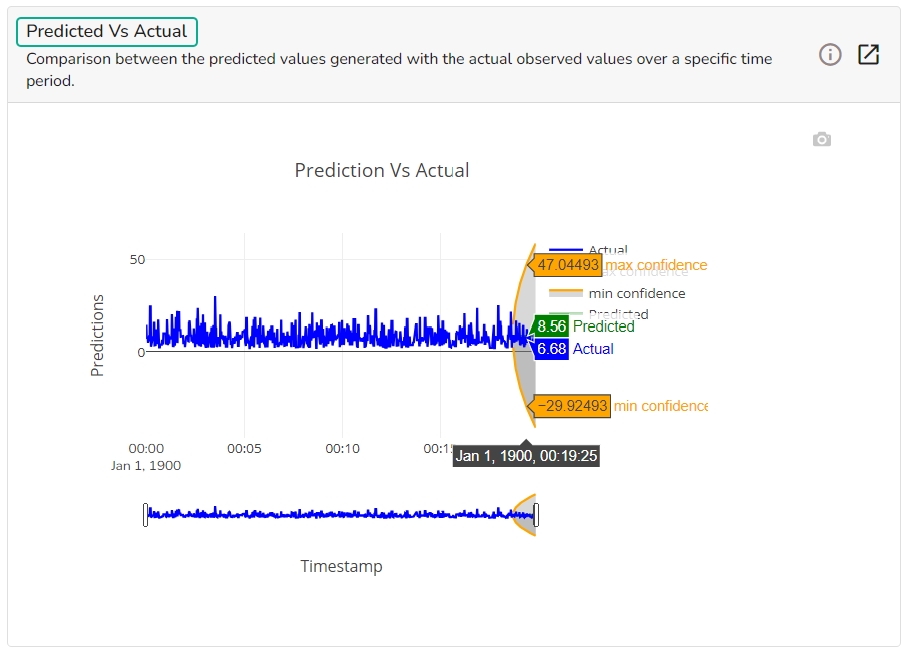 The forecasting model stats get displayed through the Timeseries visualization that presents values generated over based on the selected time.