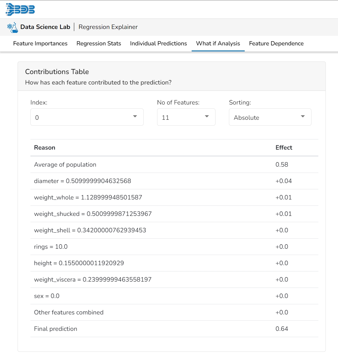 This table shows the contribution each individual feature has had on the prediction for a specific observation. The contributions (starting from the population average) add up to the final prediction. This allows you to explain exactly how each individual prediction has been built up from all the individual ingredients in the model.