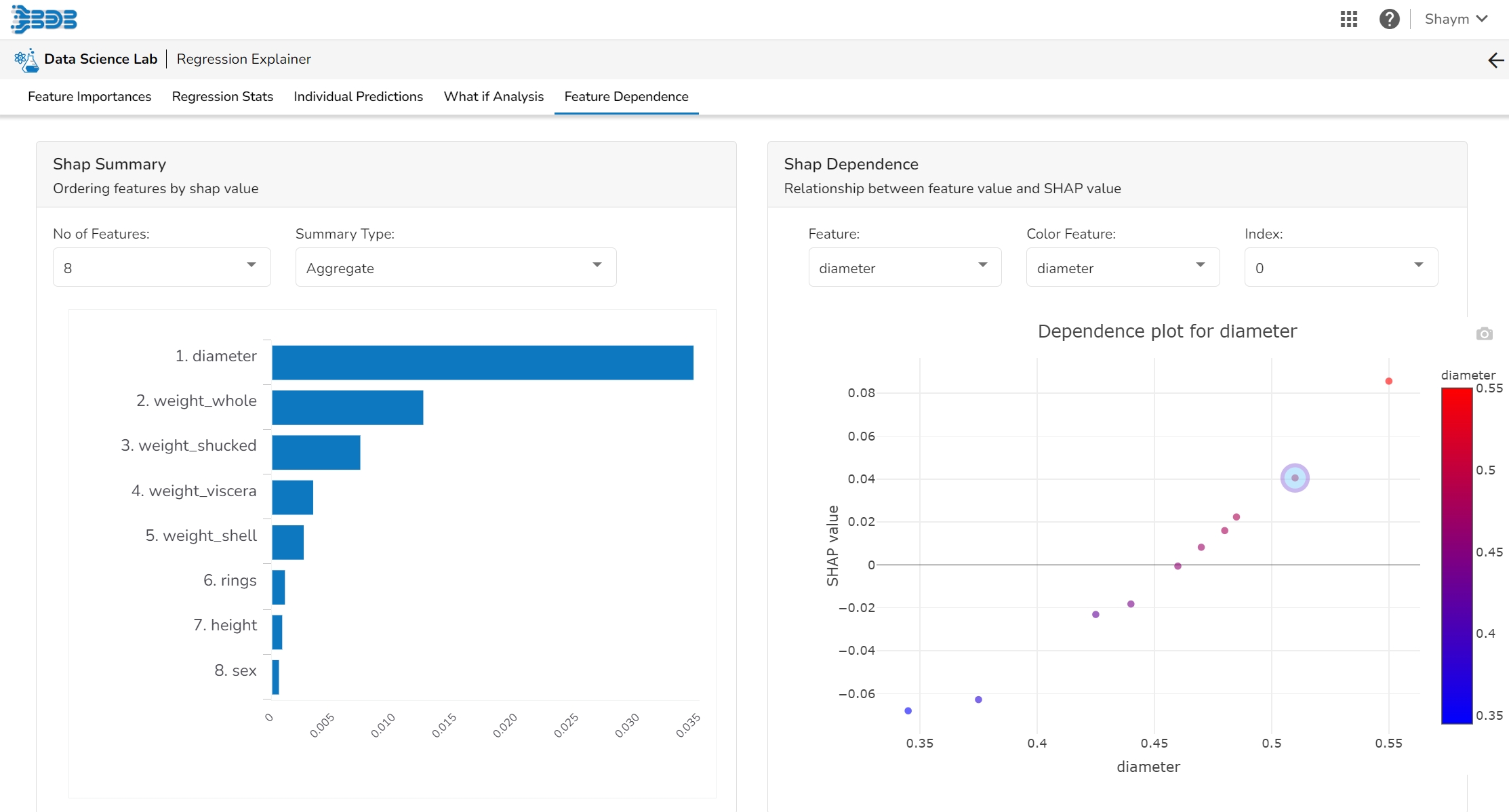The Shap Summary summarizes the Shap values per feature. The user can either select an aggregate display that shows the mean absolute Shap value per feature or get a more detailed look at the spread of Shap values per feature and how they co-relate the feature value (red is high).
