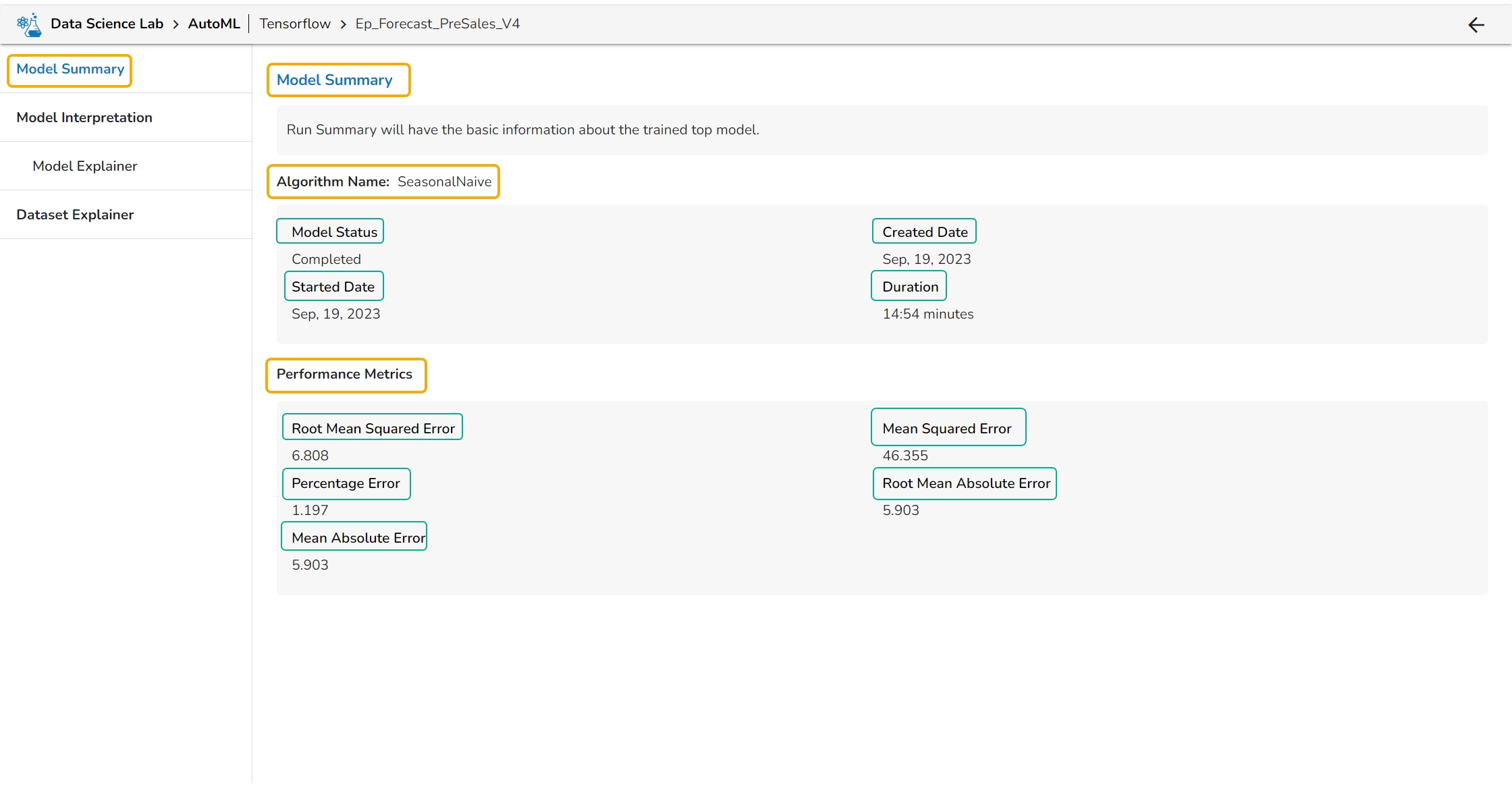 The Model Summary/ Run Summary will display the basic information about the trained top model. It opens by default by clicking the View Explanation option for the selected model.
