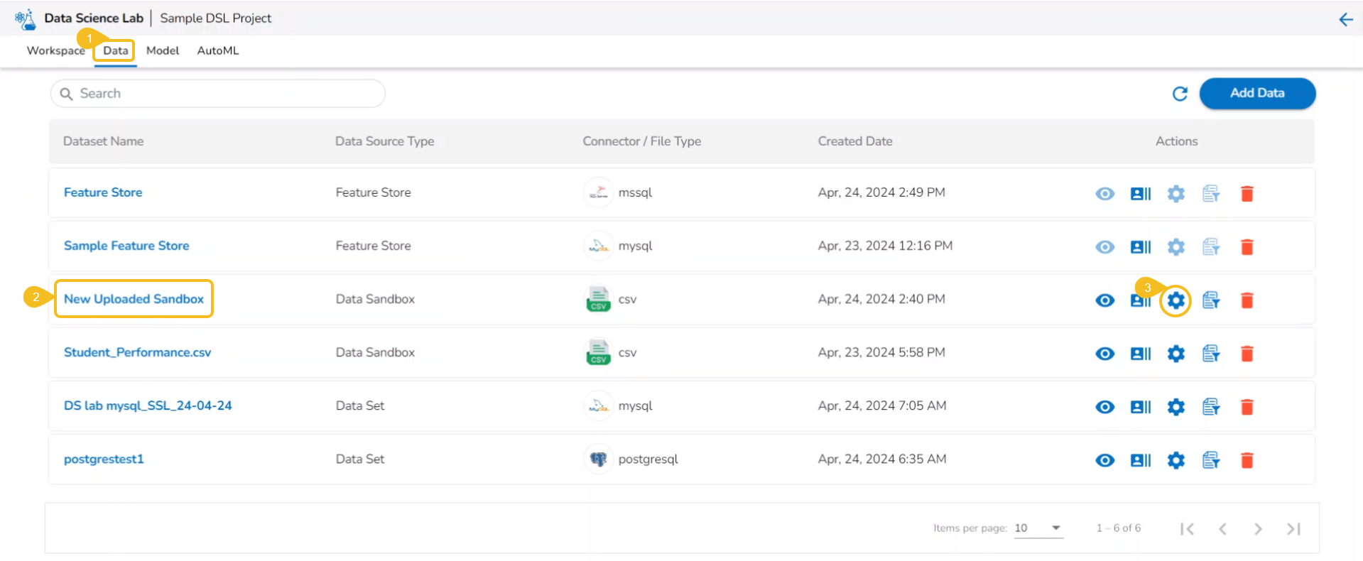 Please Note: The Create Experiment icon is provided on the Dataset List page under the Dataset tab of a Repo Sync Data Science Project.