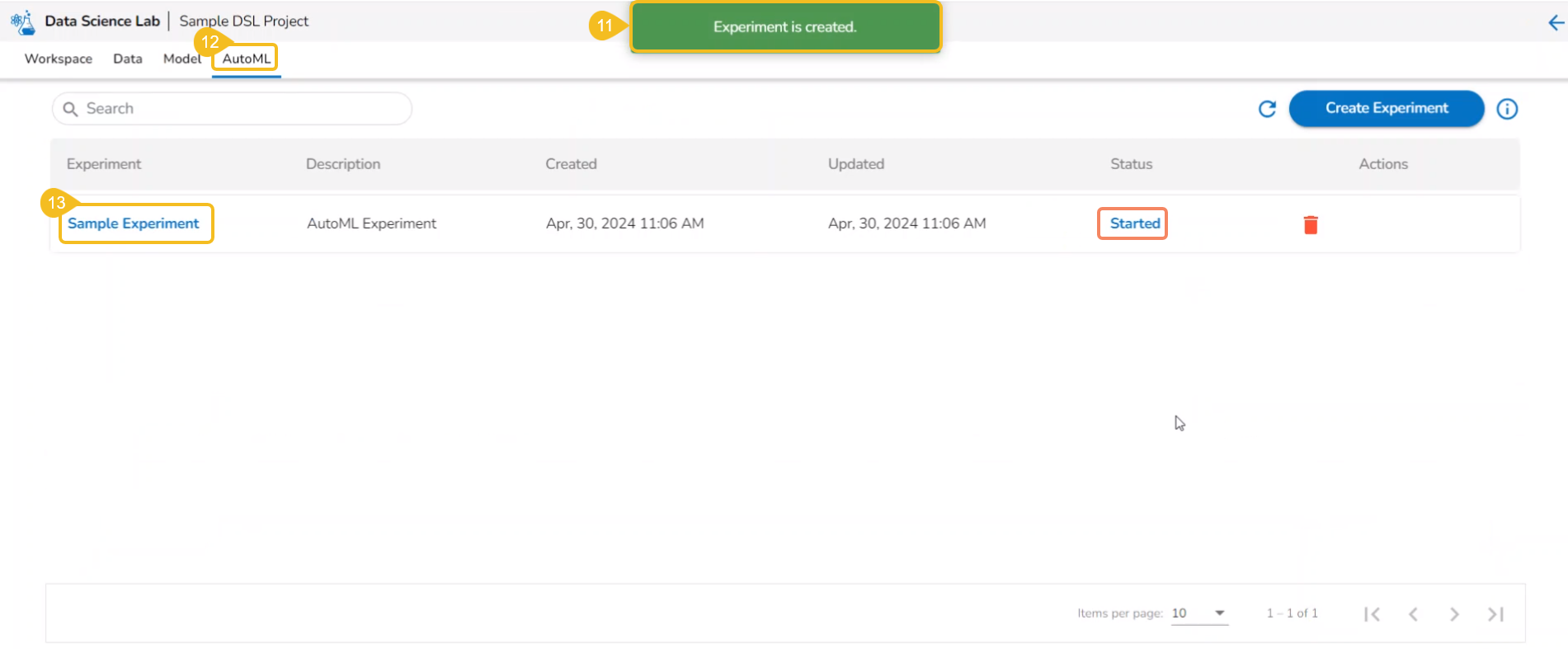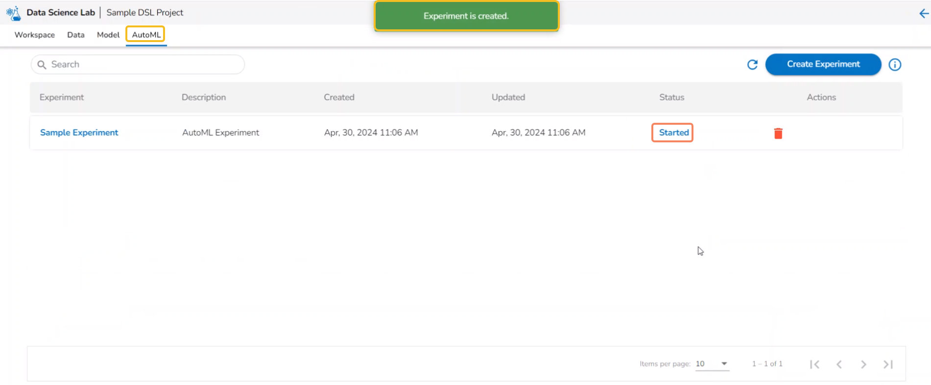The newly created experiment gets added to the list with Status mentioned as Started.