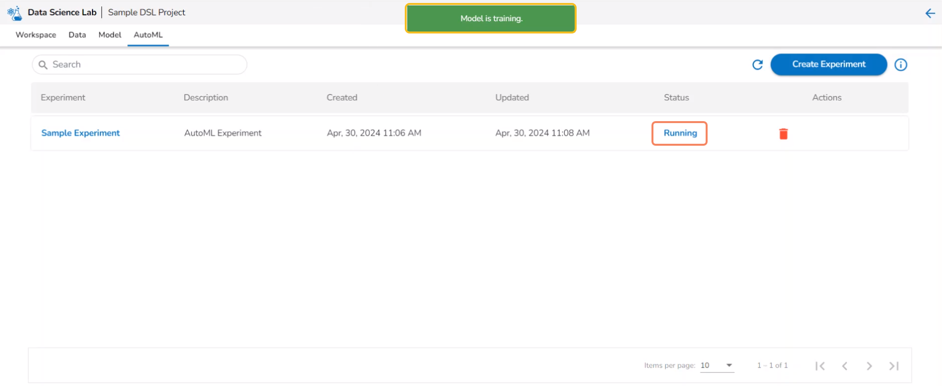 Another notification message appears to inform the user that the model training has started. The same is indicated through the Status column of the model. The Status for such models will be Running.