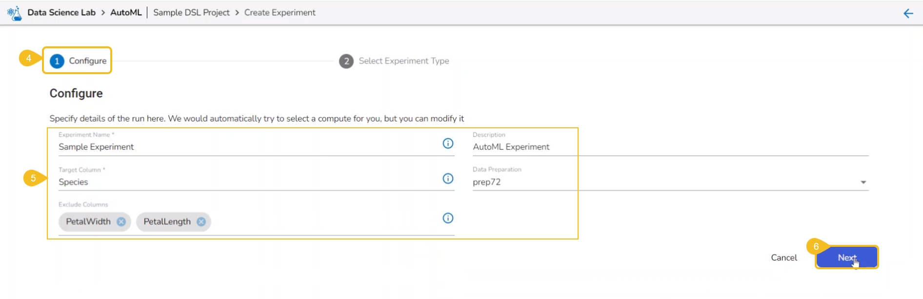 Creating an Experiment is a two-step process that involves configuration and selection of the algorithm type as steps.