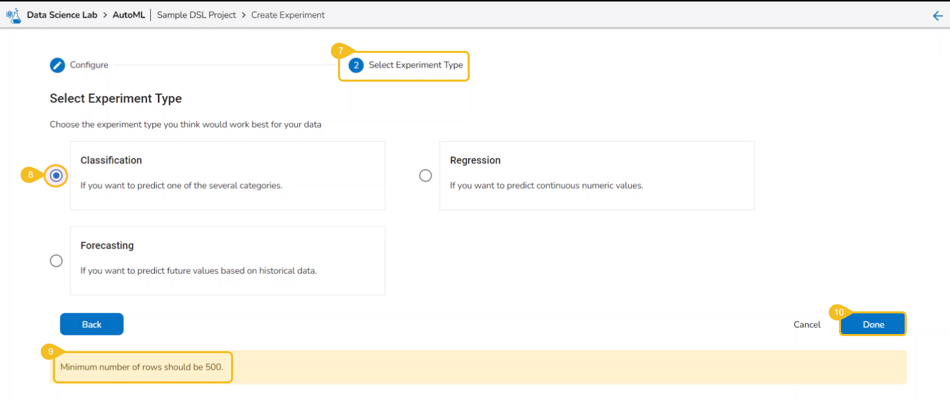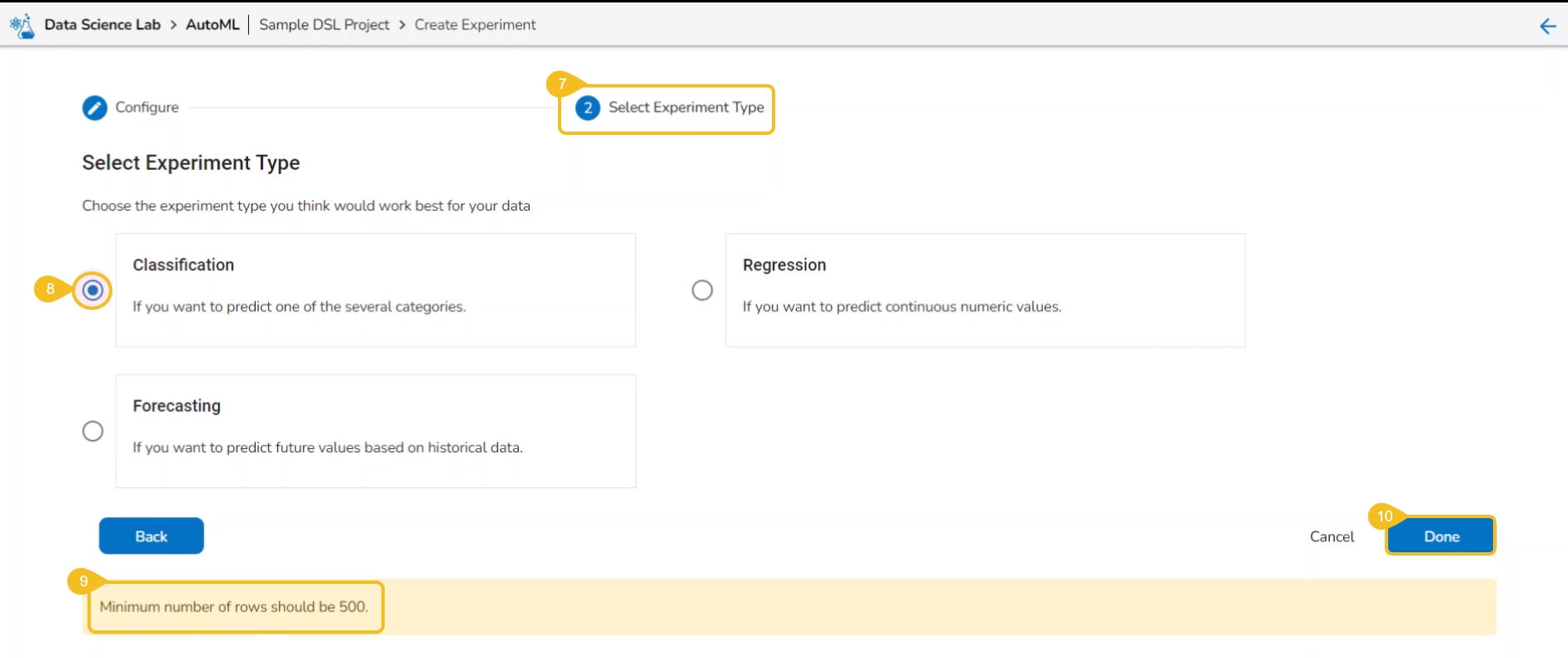 There can be different types of Experiments based on the algorithm type specified. In the DS Lab module, we currently support Classification, Regression, and Forecasting.