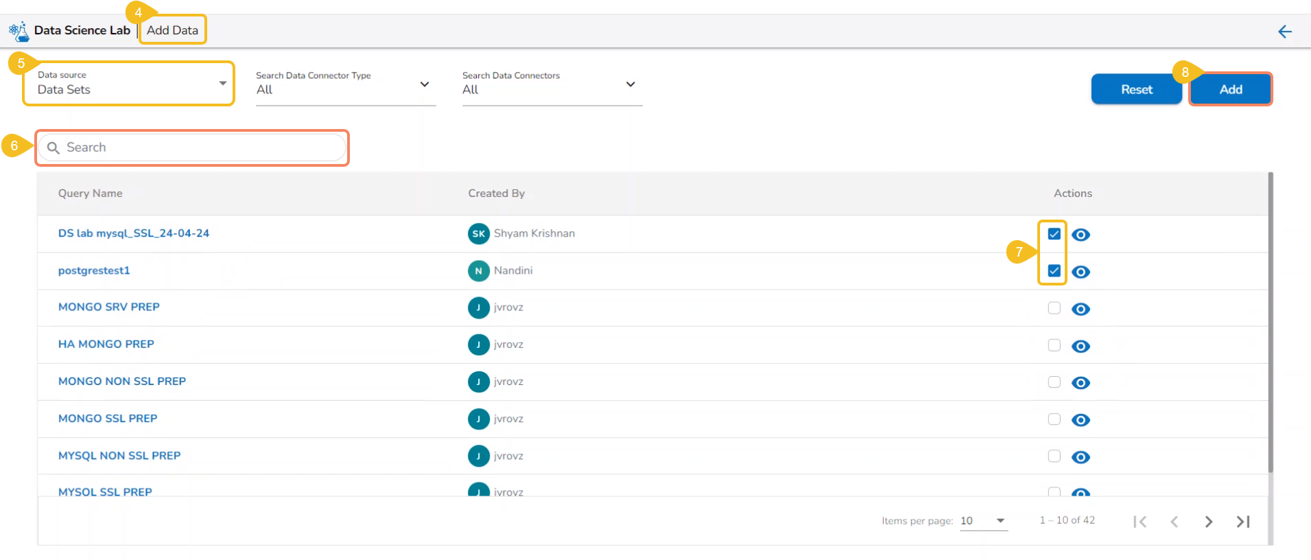 Please Note: The users get a search bar to search across the multiple Datasets options on the Add Datasets page.