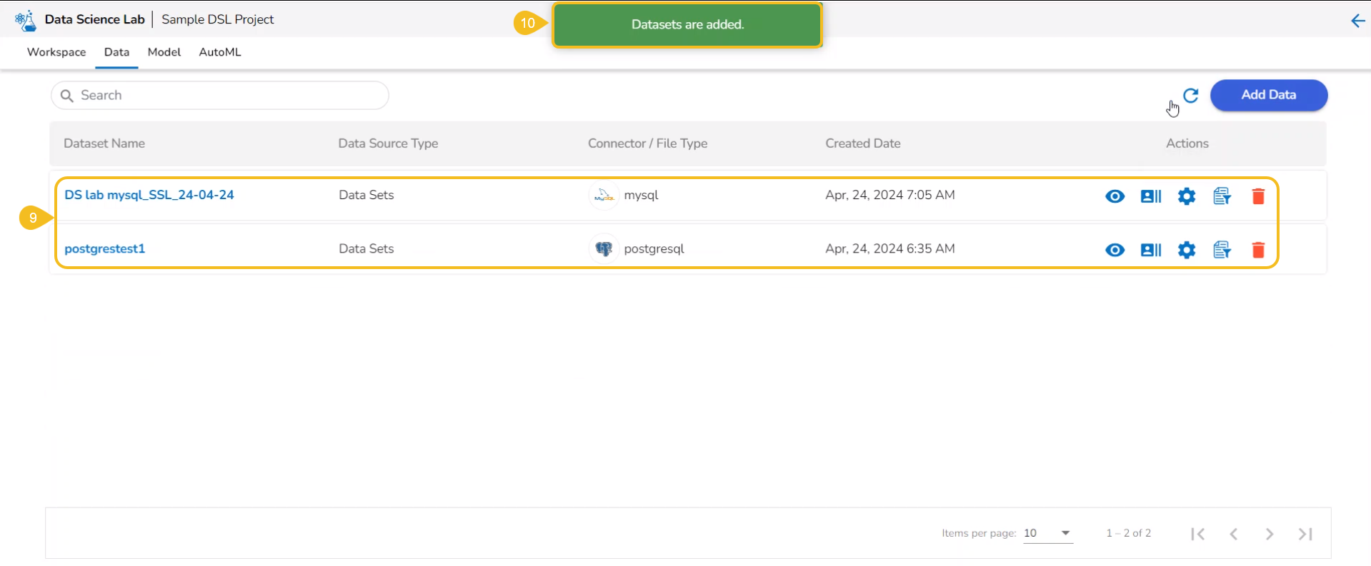 The user gets redirected to the Dataset tab where the added dataset file gets listed.