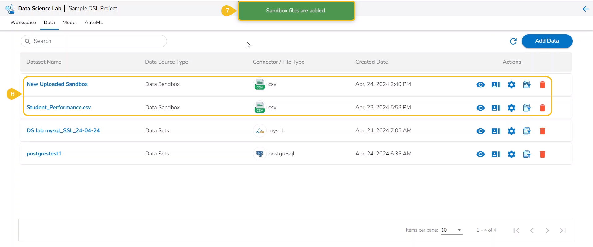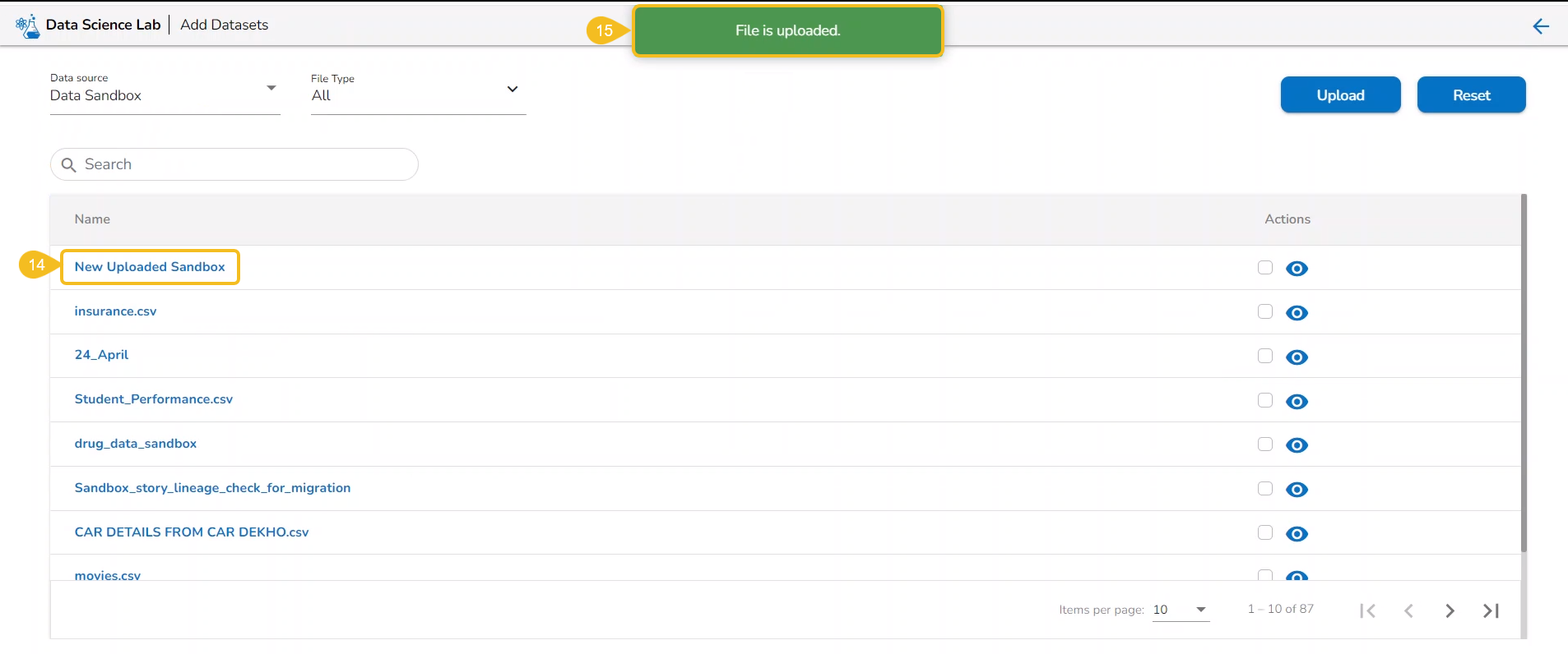 The uploaded sandbox file gets added under the Add Datasets page.