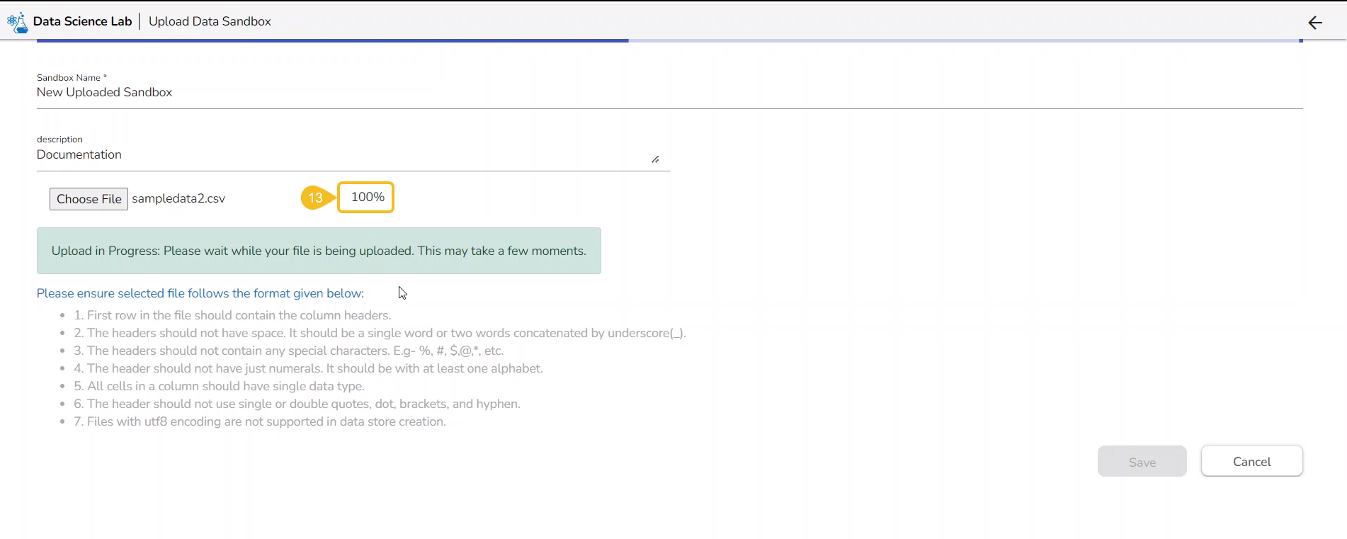 Click the Upload option to upload a Data Sandbox file.
