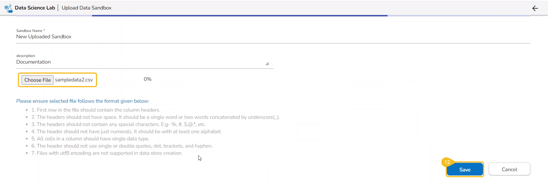 The user gets redirected to the Upload Data Sandbox page.