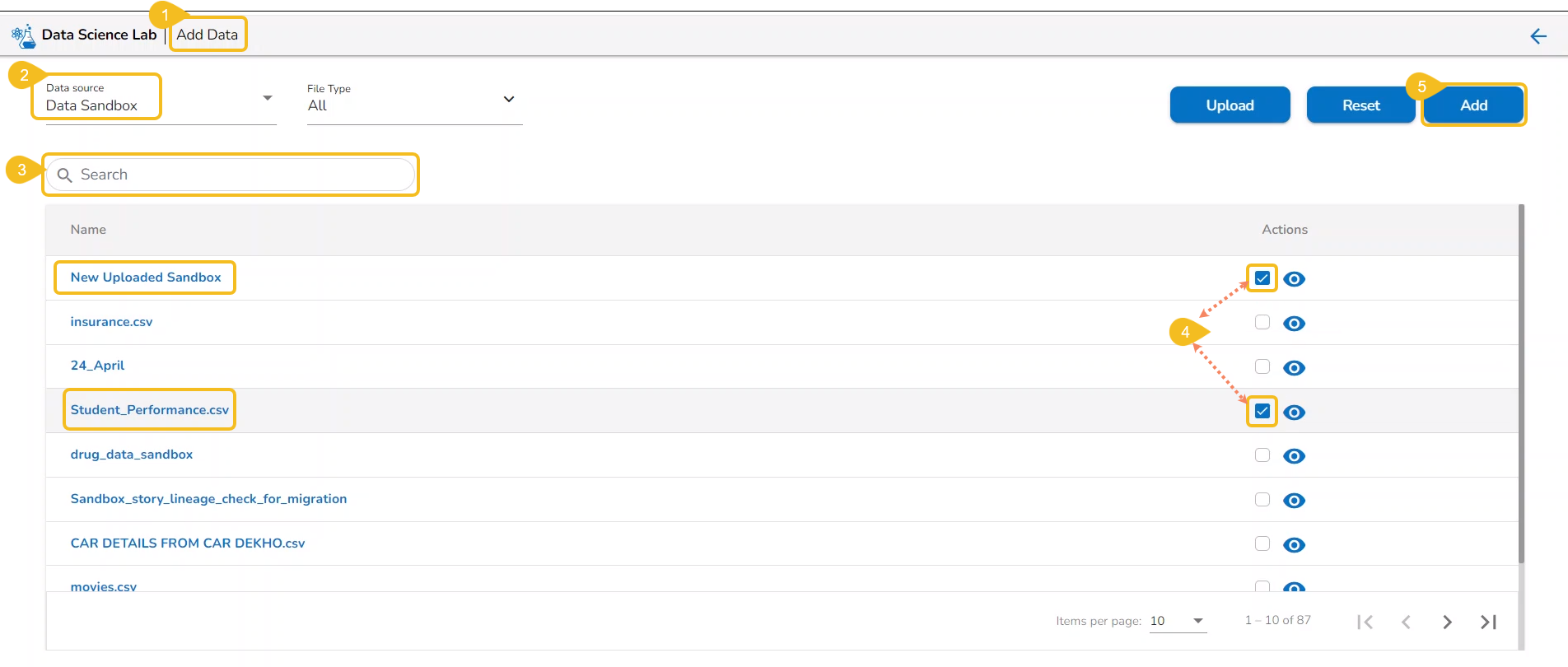 Select Data Sandbox files using the checkbox given next to the Sandbox entry (The uploaded Data Sandbox file appears at the top of the list).