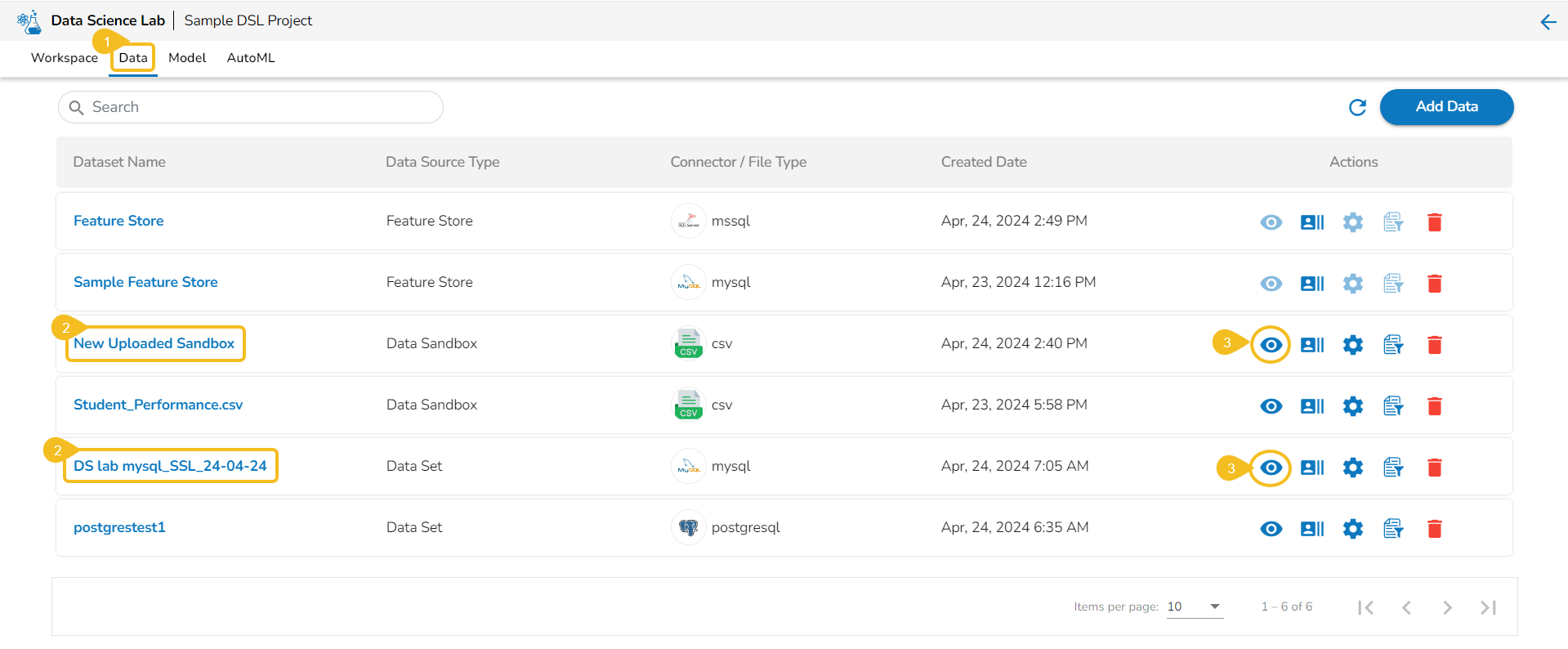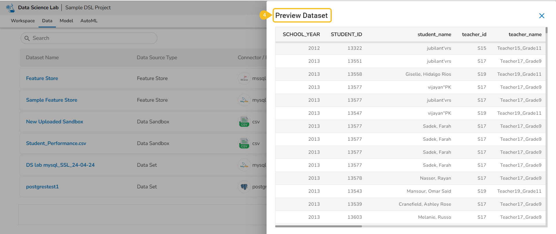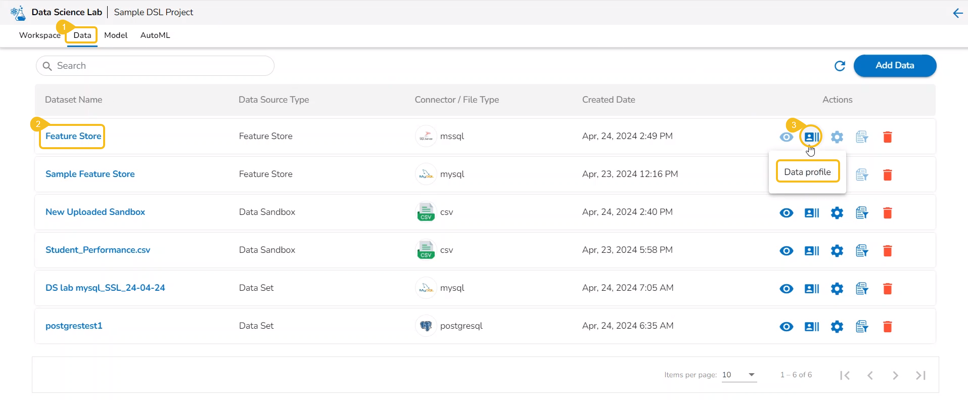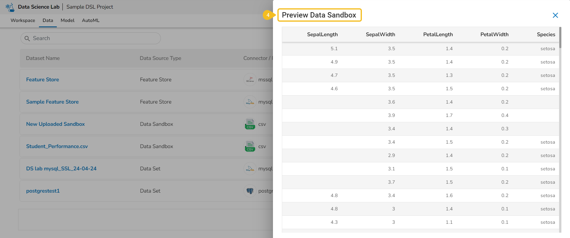 Please Note: The Preview, Create Experiment, and Data Preparation Actions are not supported for the Datasets based on a Feature Store.