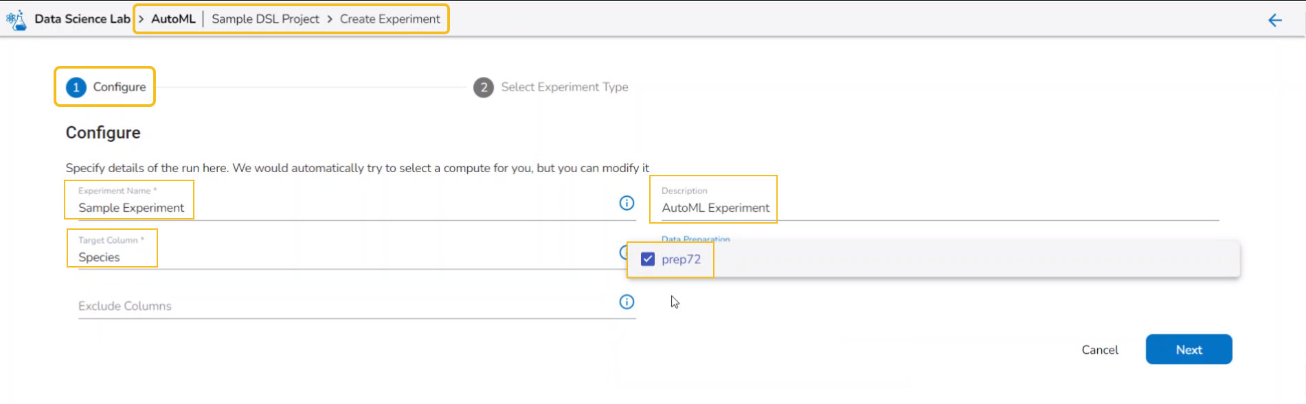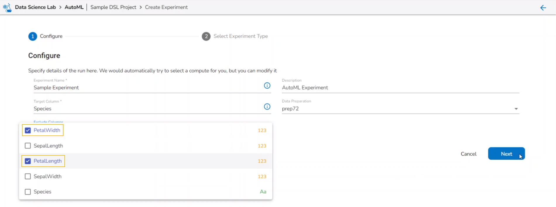 Selecting Data Preparation from the dropdown menu Select columns that need to be excluded from the experiment.