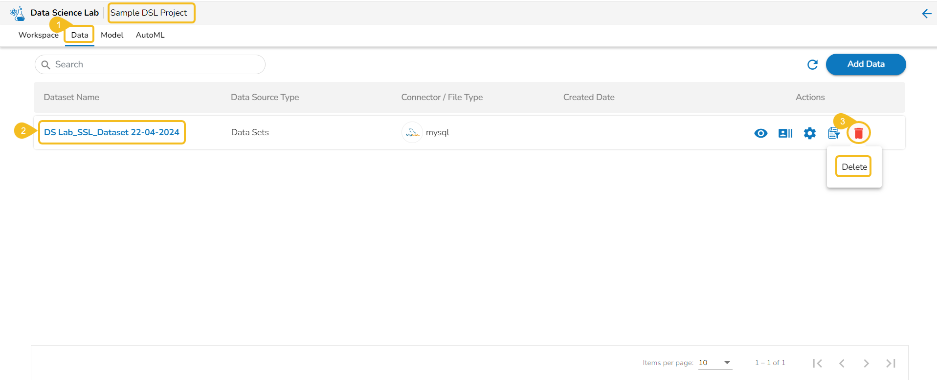 This section of the document describes the actions attributed to the added data inside a Data Science Lab project.