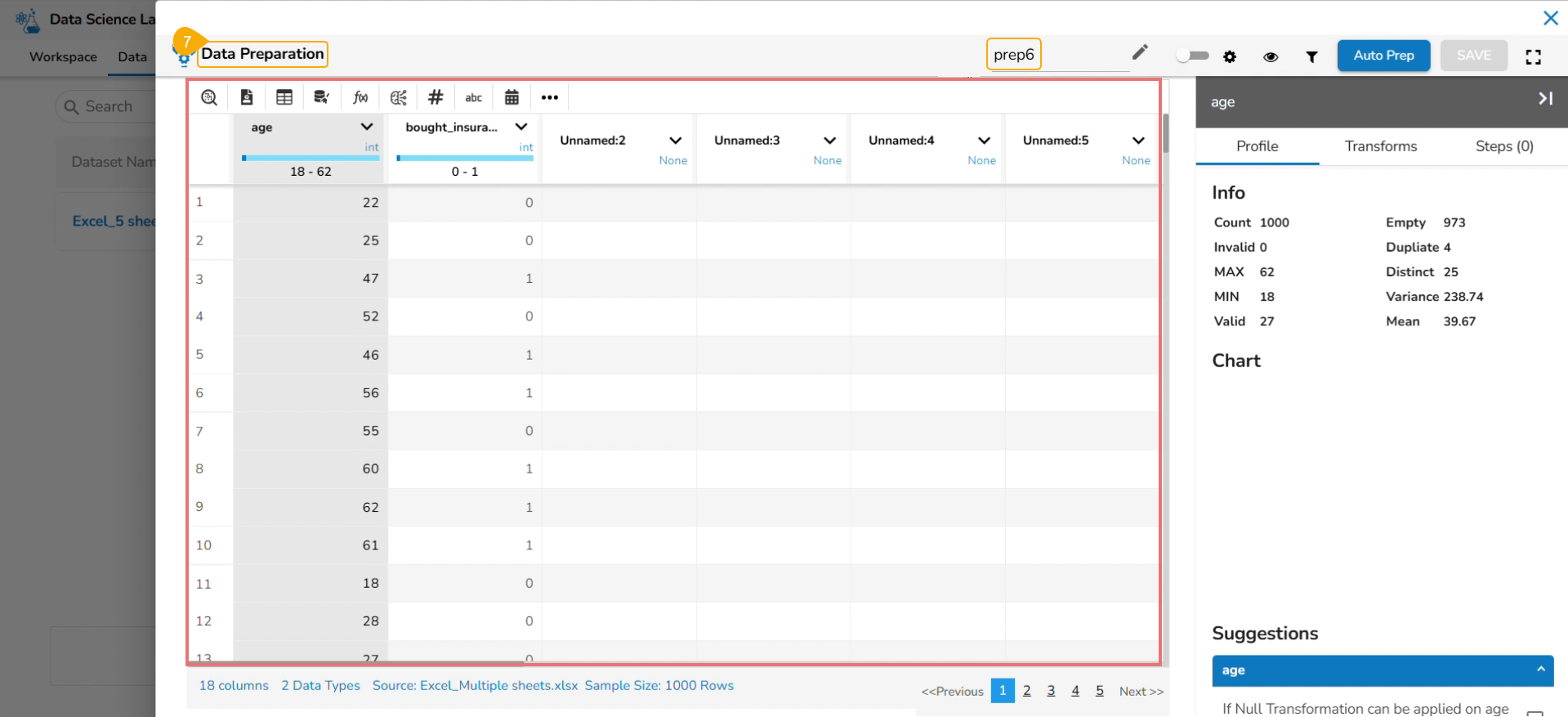 The Data Preparation page opens displaying the dataset in the grid format.