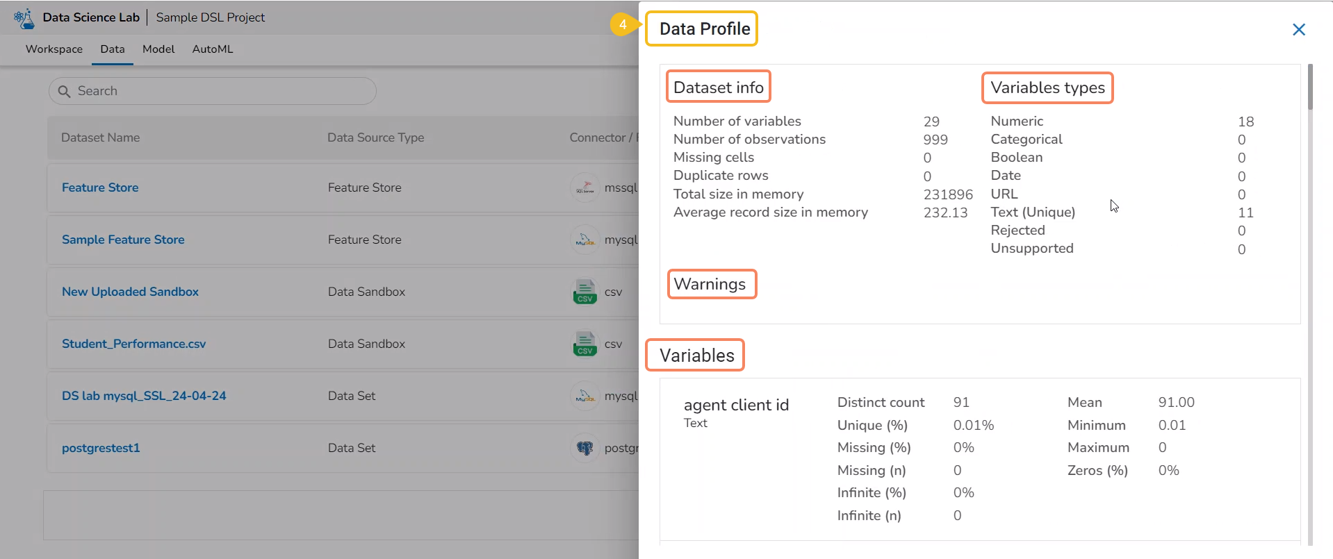 The Data Profile drawer opens displaying the Data Set information, Variable Types, Warnings, Variables, Correlation chart, missing values, and sample.