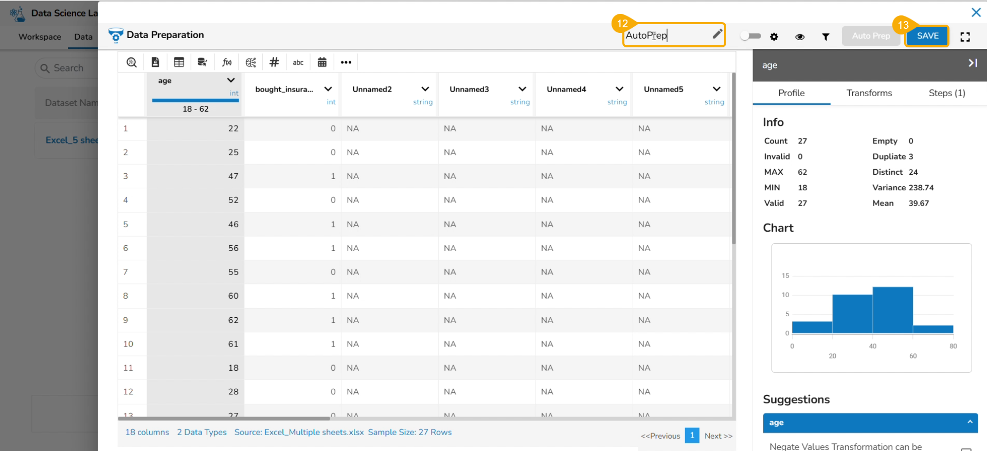 The selected AutoPrep transforms are applied to the dataset. Provide a name for the Data Preparation.